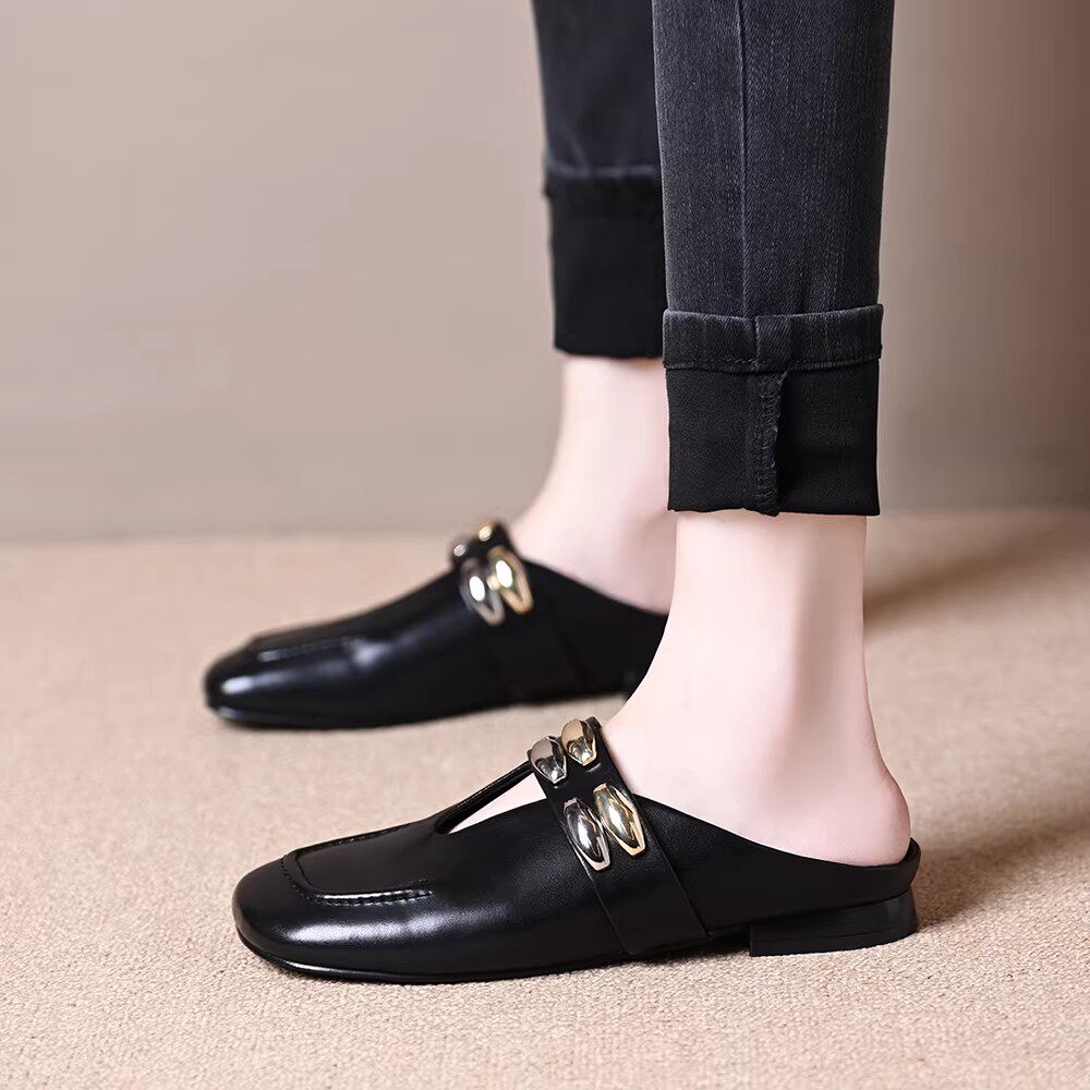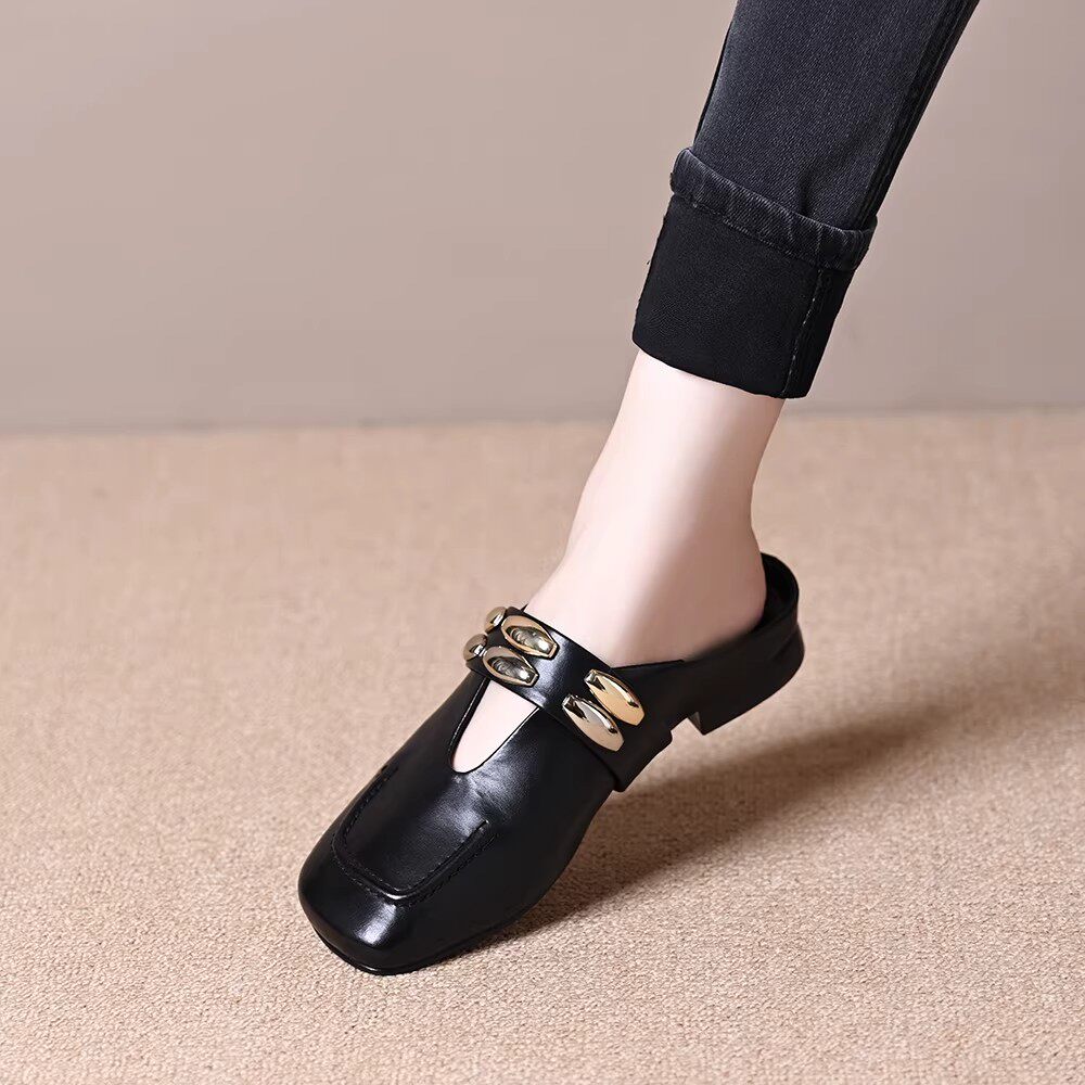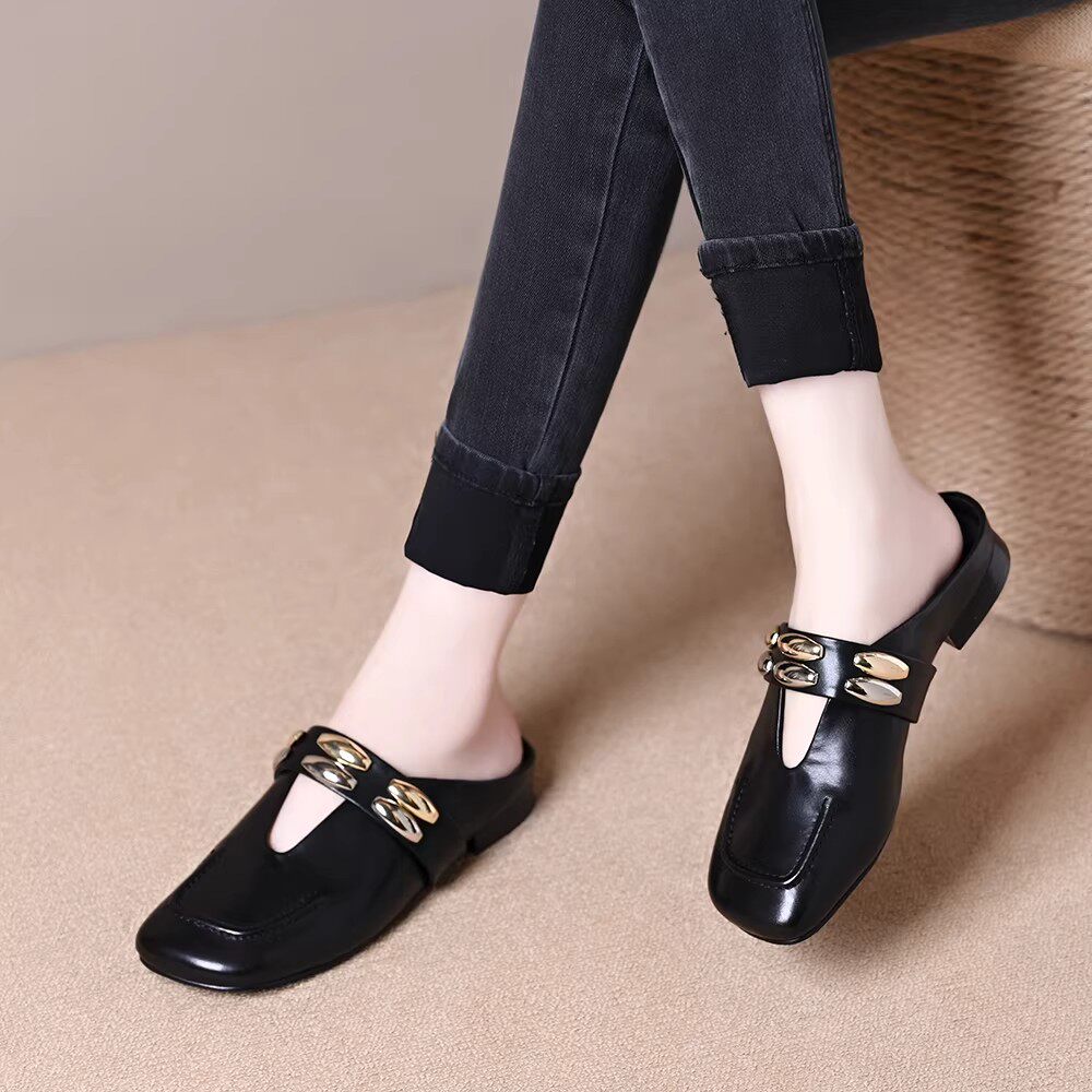 品牌红蜓青同款女鞋百搭舒适软底时尚铆钉扣件包头软皮半拖鞋女