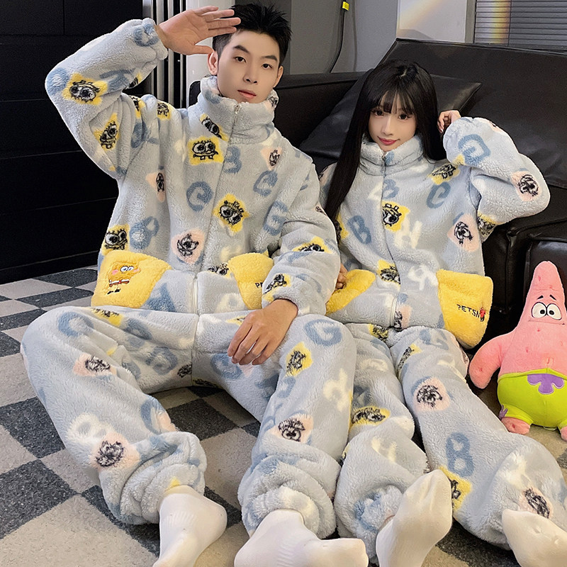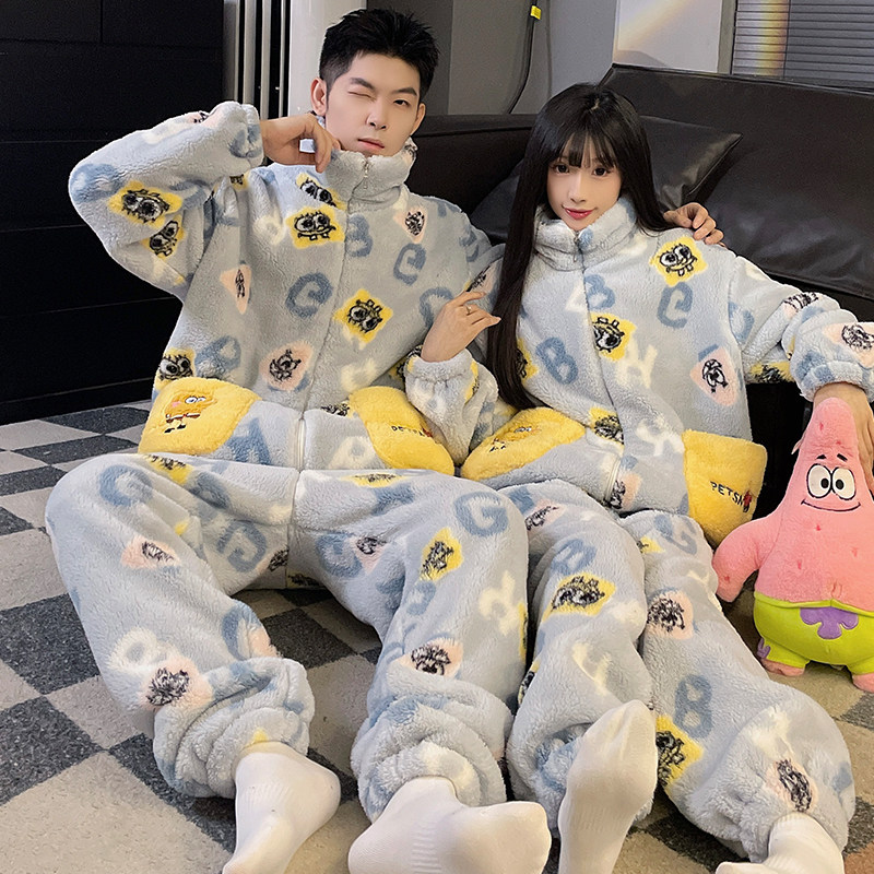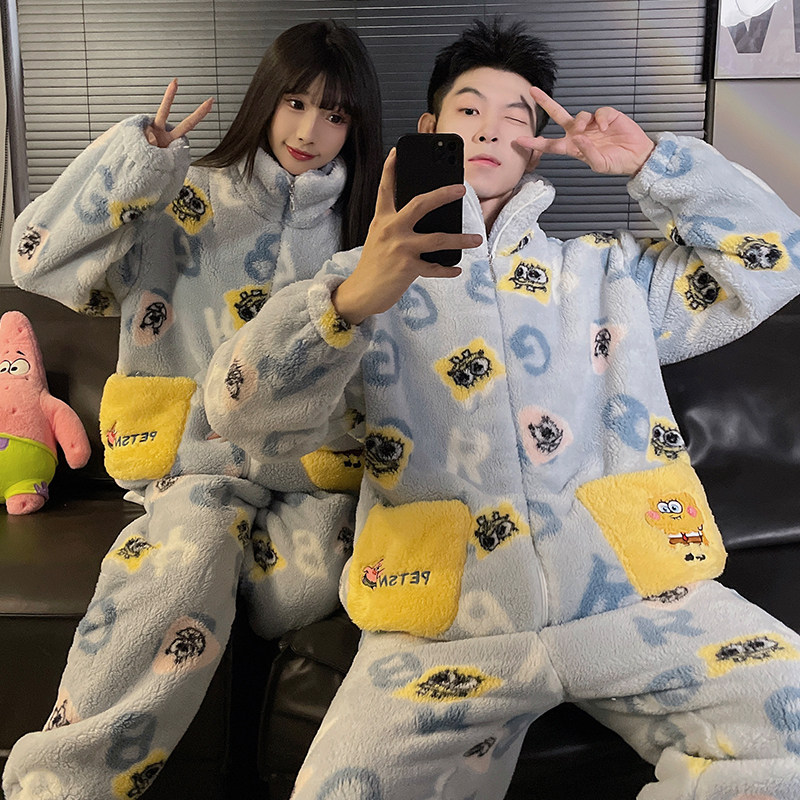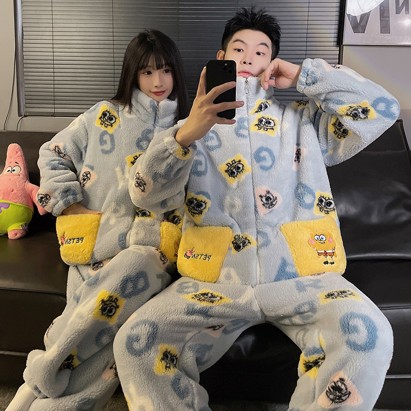 新款秋冬季海绵宝宝情侣睡衣女款珊瑚绒加绒加厚家居服可外穿薄款