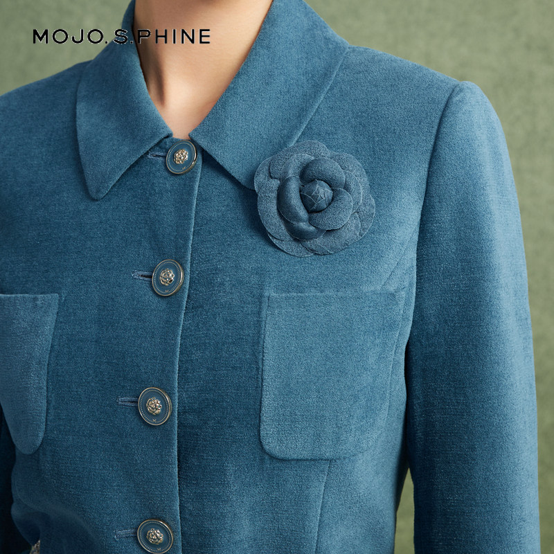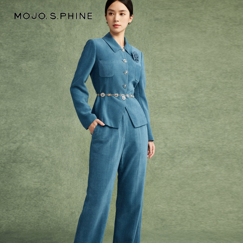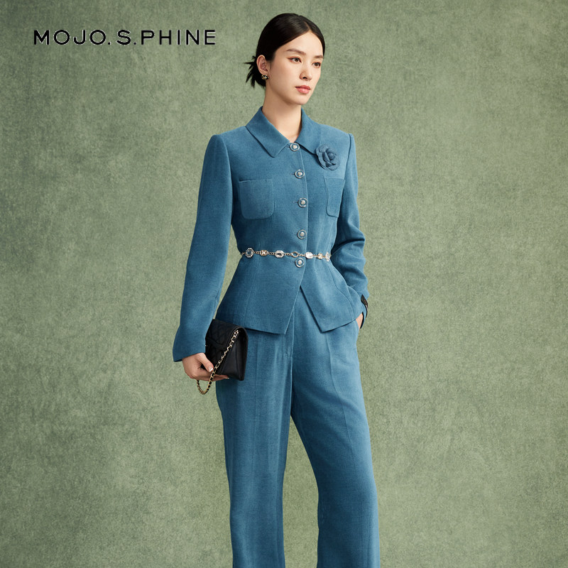 朗姿集团MOJO莫佐绒光湖水蓝小翻领西装2024年秋冬新款时尚收腰气