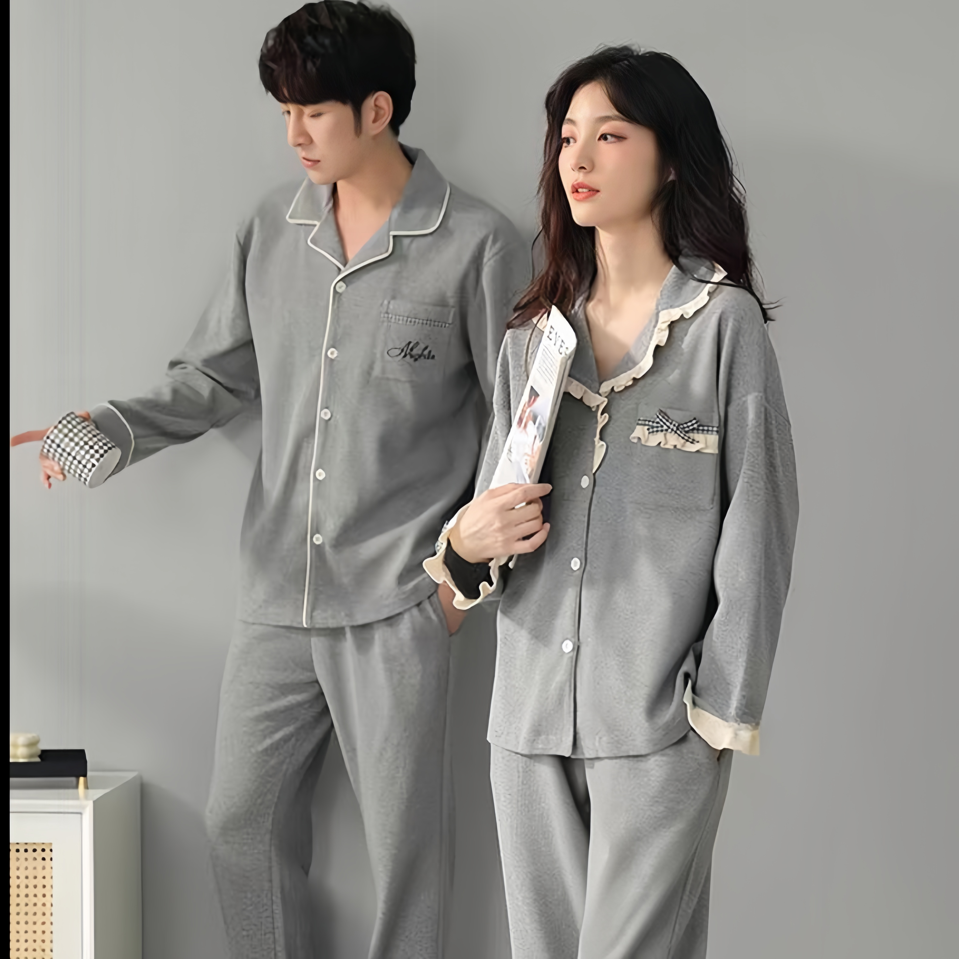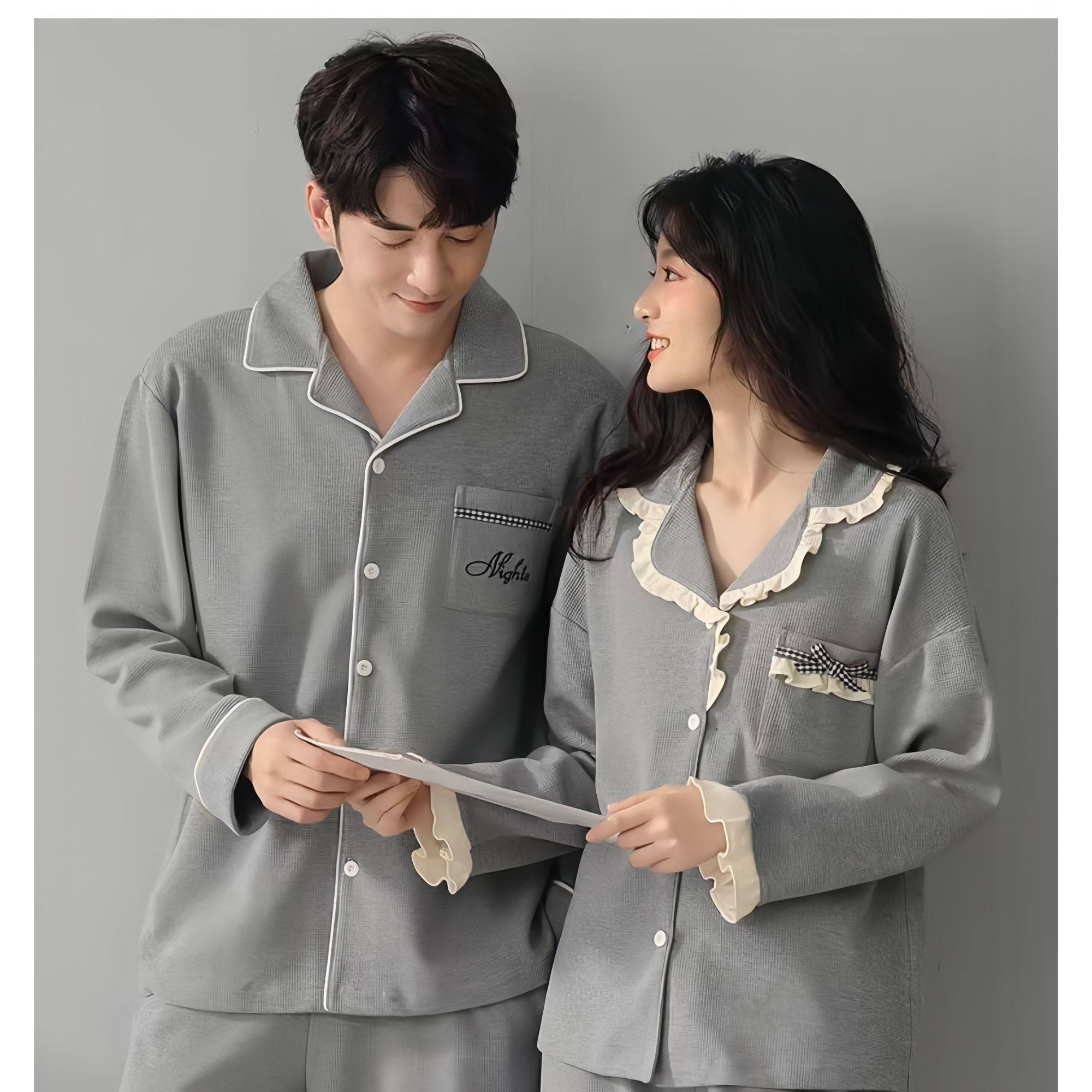 安比斯情侣睡衣舒适纯棉秋季女长袖男女同款休闲家居服套装可出门