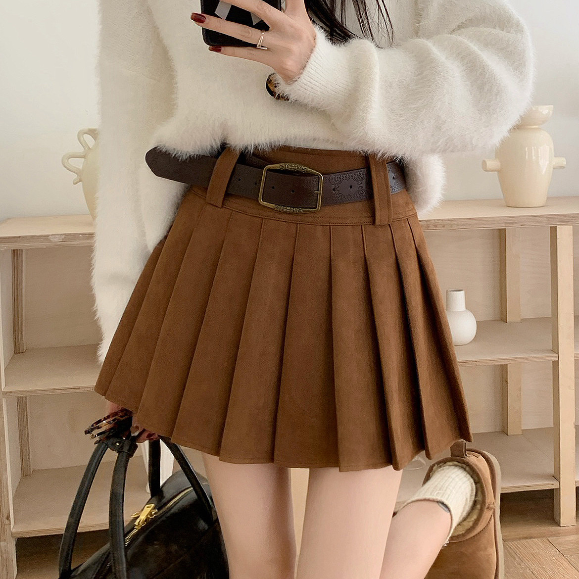 大码棕色麂皮绒百褶裙女秋冬显瘦防走光a字短裙学院风咖色半身裙