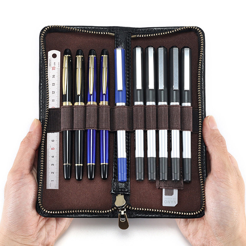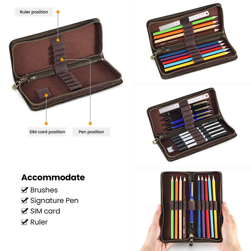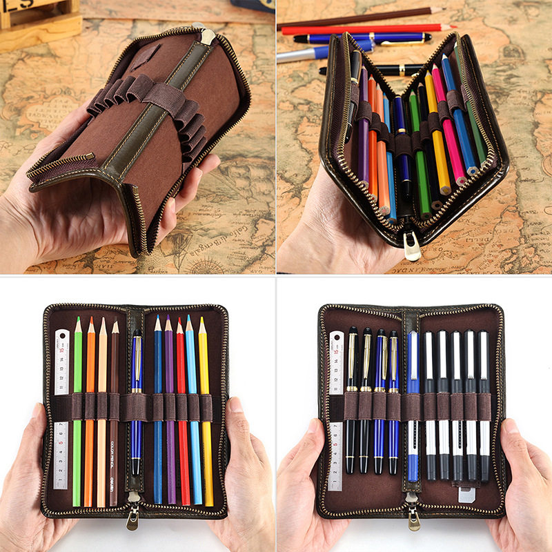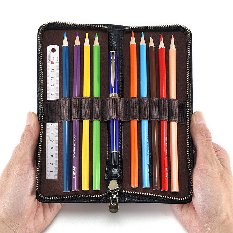 大容量笔袋12插位彩铅笔拉链收纳包头层牛皮时尚便携分类整理笔袋