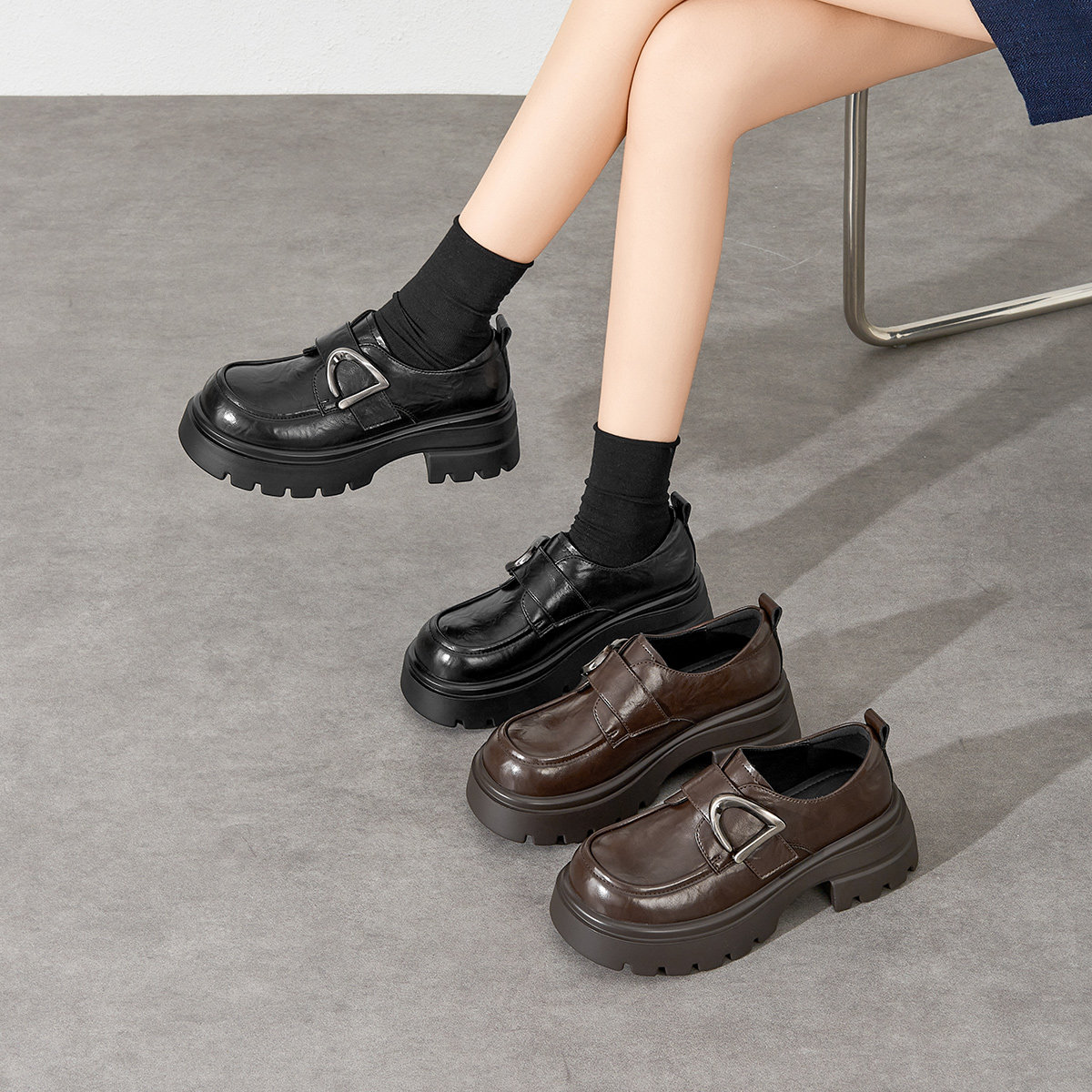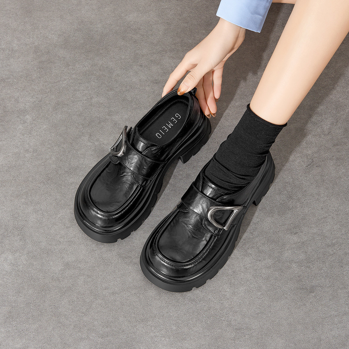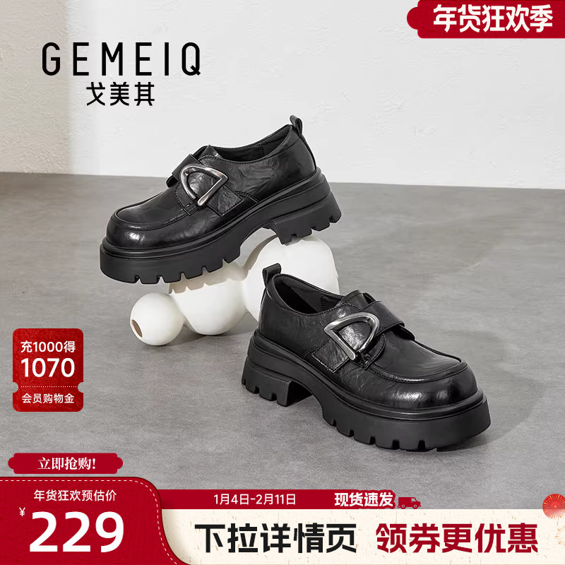 戈美其商场同款厚底乐福鞋女2026新款高跟英伦风黑色小皮鞋一脚蹬