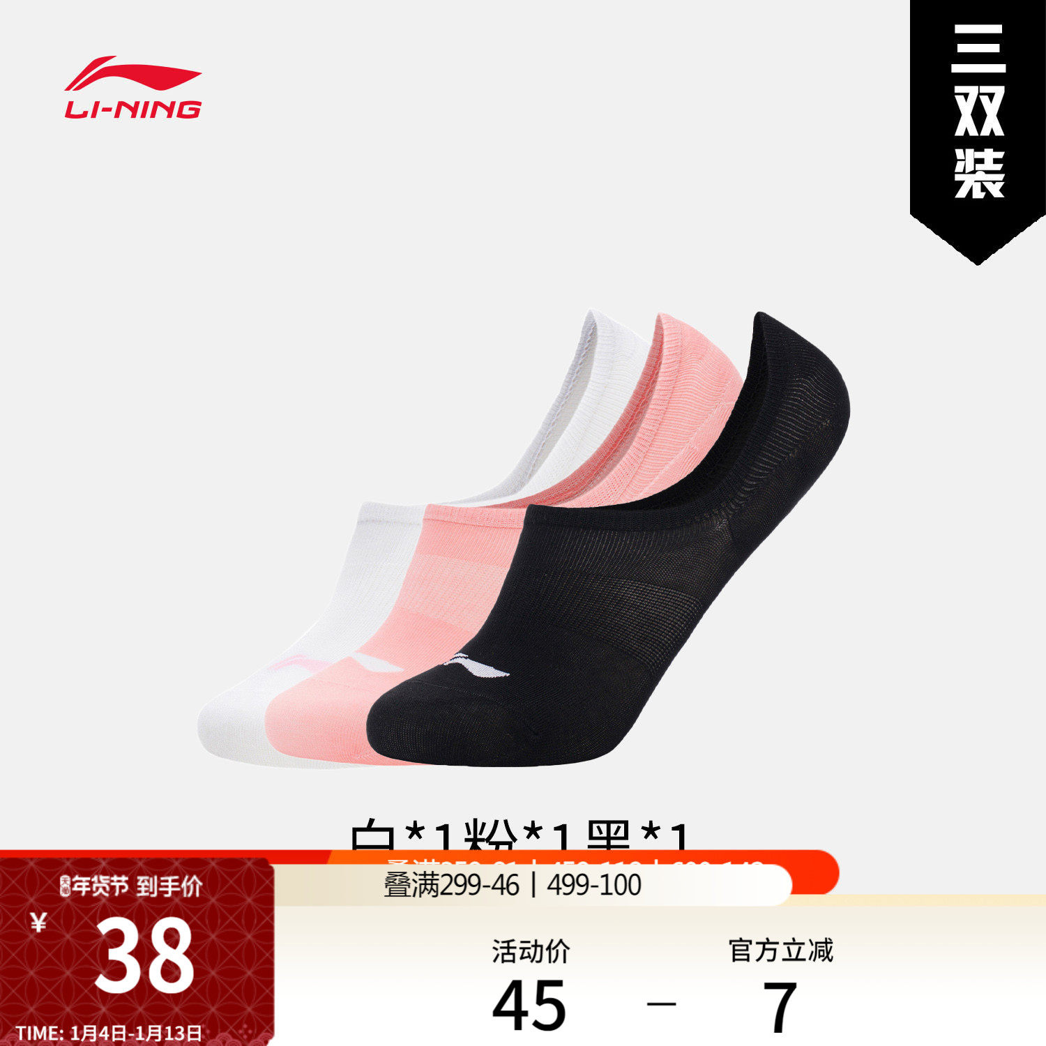 李宁船袜隐身袜女士官方正品黑白棉质短袜吸汗透气三双装运动袜子