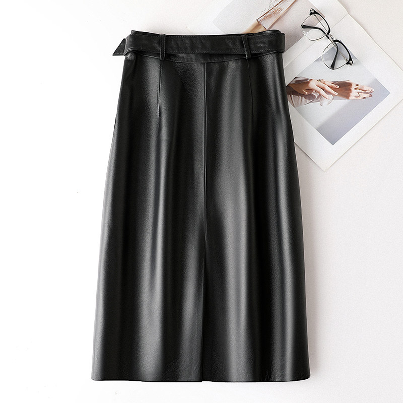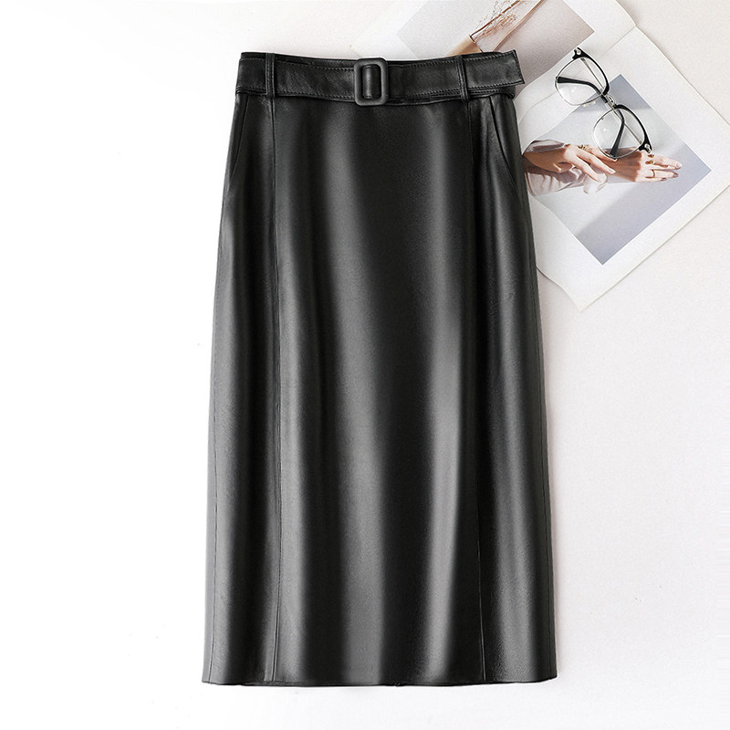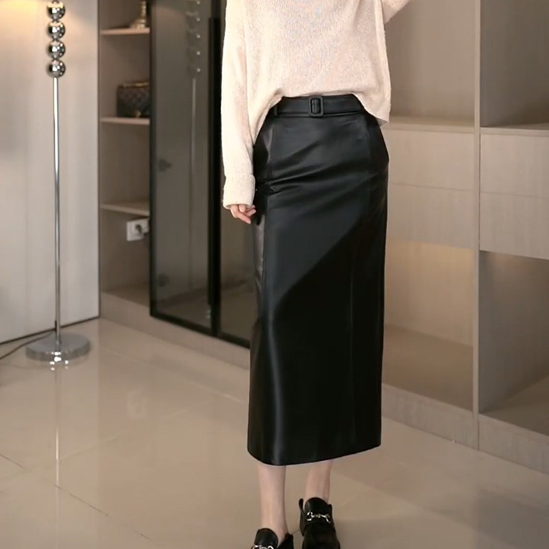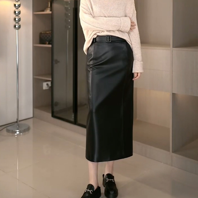 2281羊皮皮裙女秋冬新款高腰显瘦百搭过膝长款半身裙裹裙直筒裙