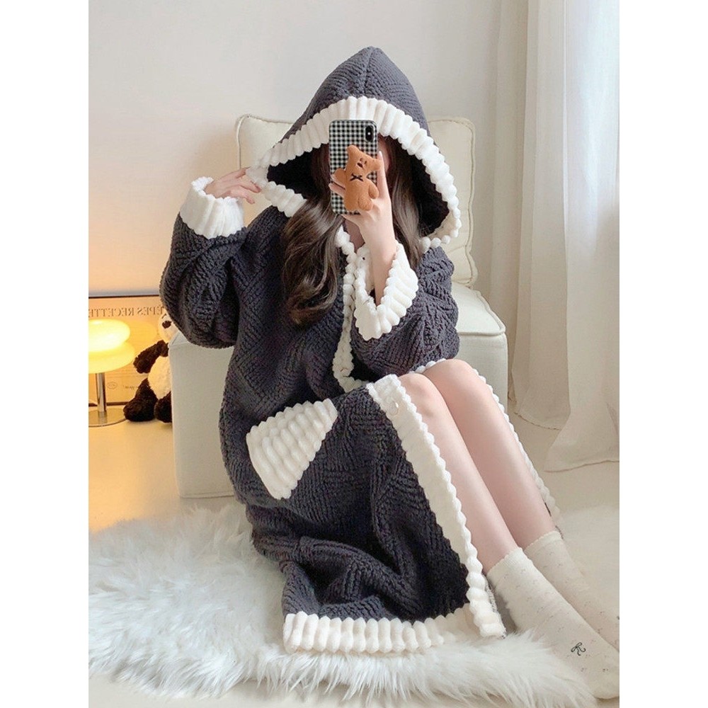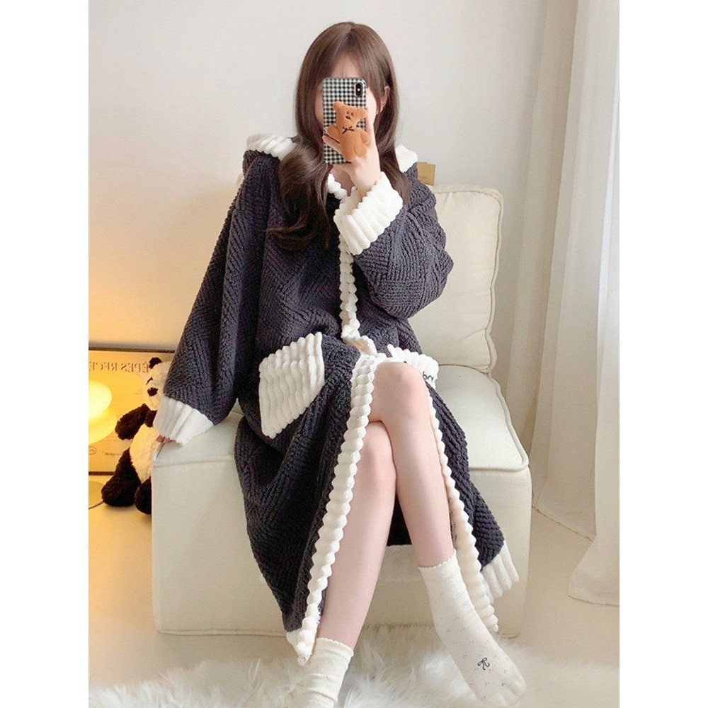 yso【酷猫系列】睡衣女秋冬新款毛绒长款连帽加厚保暖开衫睡袍D