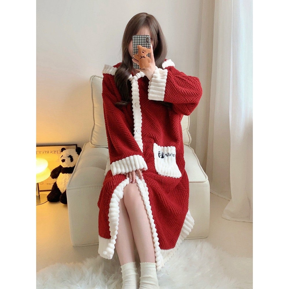 红豆睡衣女秋冬季加厚珊瑚绒开衫纽扣连帽睡袍高级感可外穿家居服