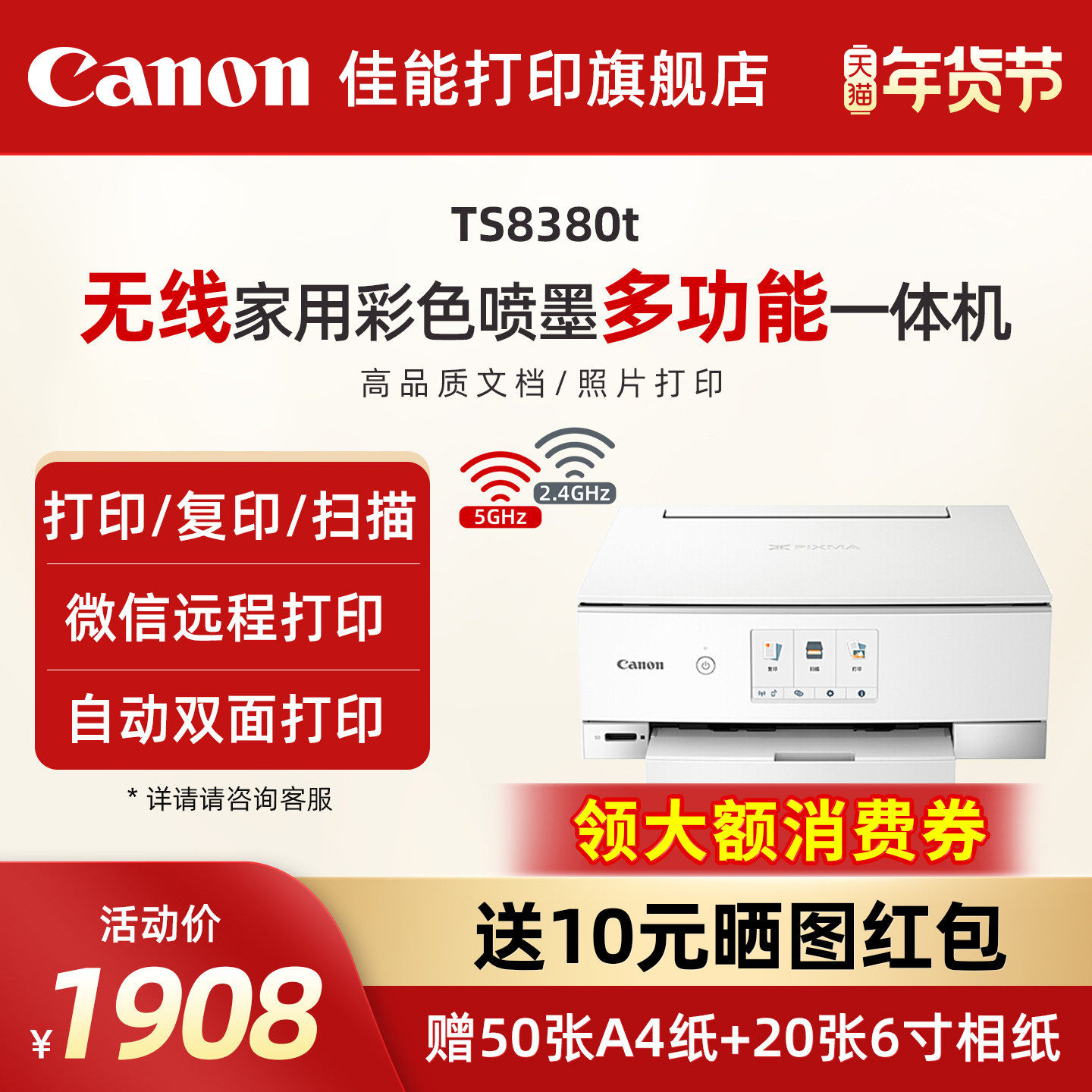 佳能旗舰店TS8380t彩色A4喷墨6色打印复印扫描一体机学生家用小型微信远程打印自动双面高清照相片办公