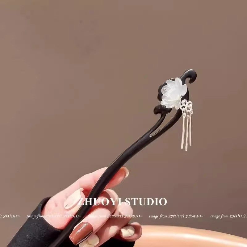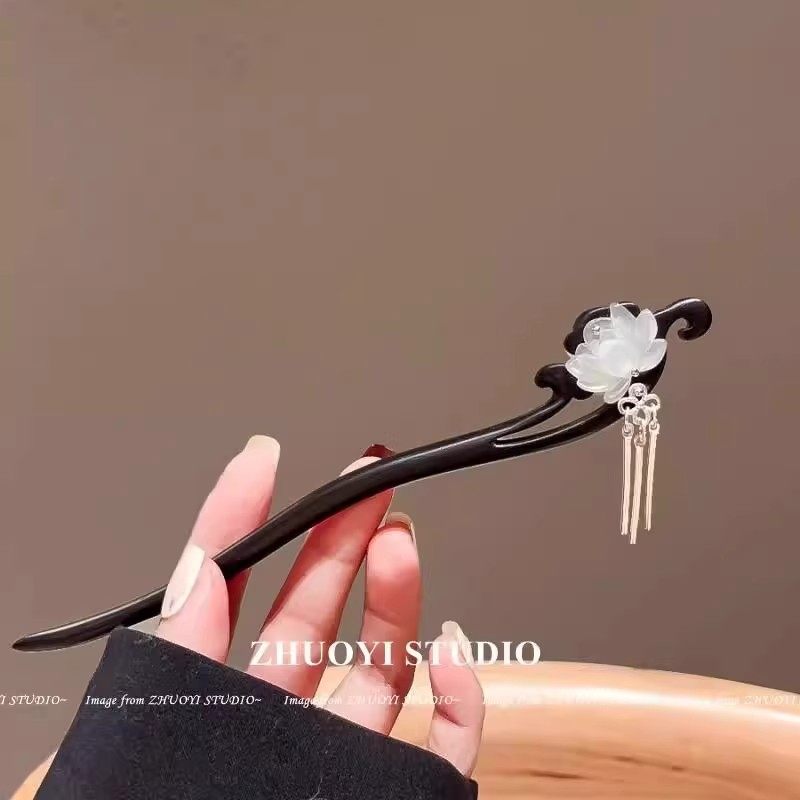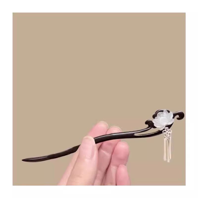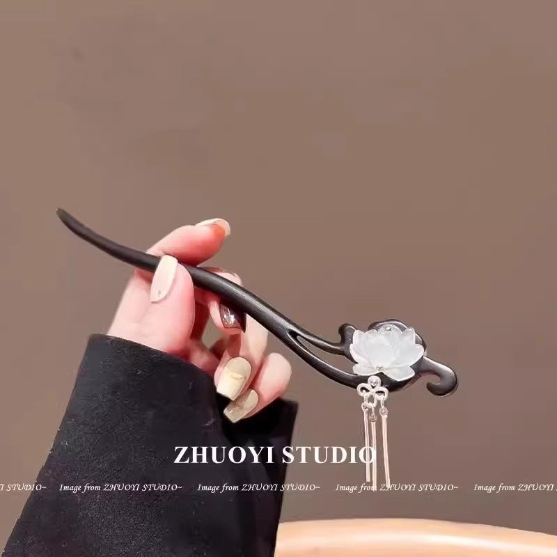 日常莲花檀木发簪女中式步摇流苏盘发簪子古风高级感发钗配饰双面