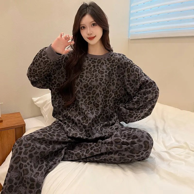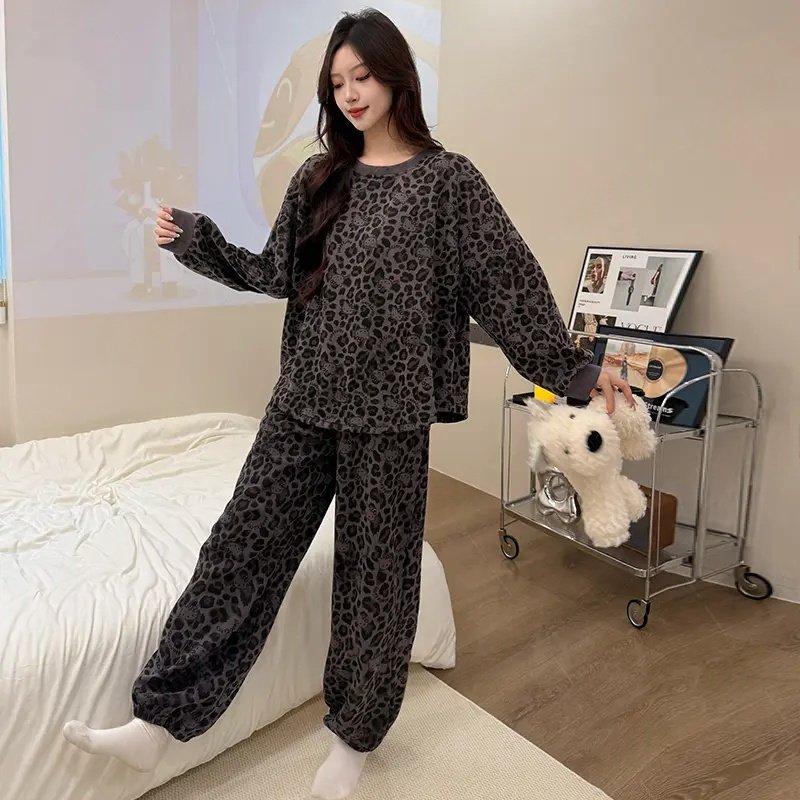 棉绸睡衣女秋冬季2025新款带胸垫长袖套装豹纹冬天家居服条纹外出