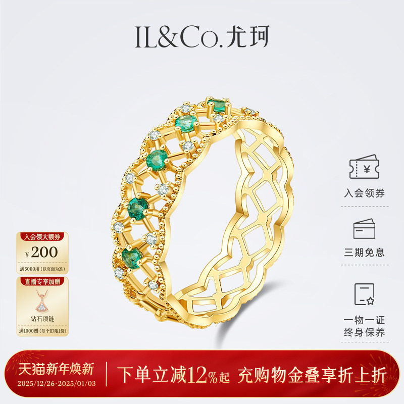 ILCO尤珂 「花野迷踪」18K金祖母绿女戒天然彩宝蕾丝绿宝石排戒