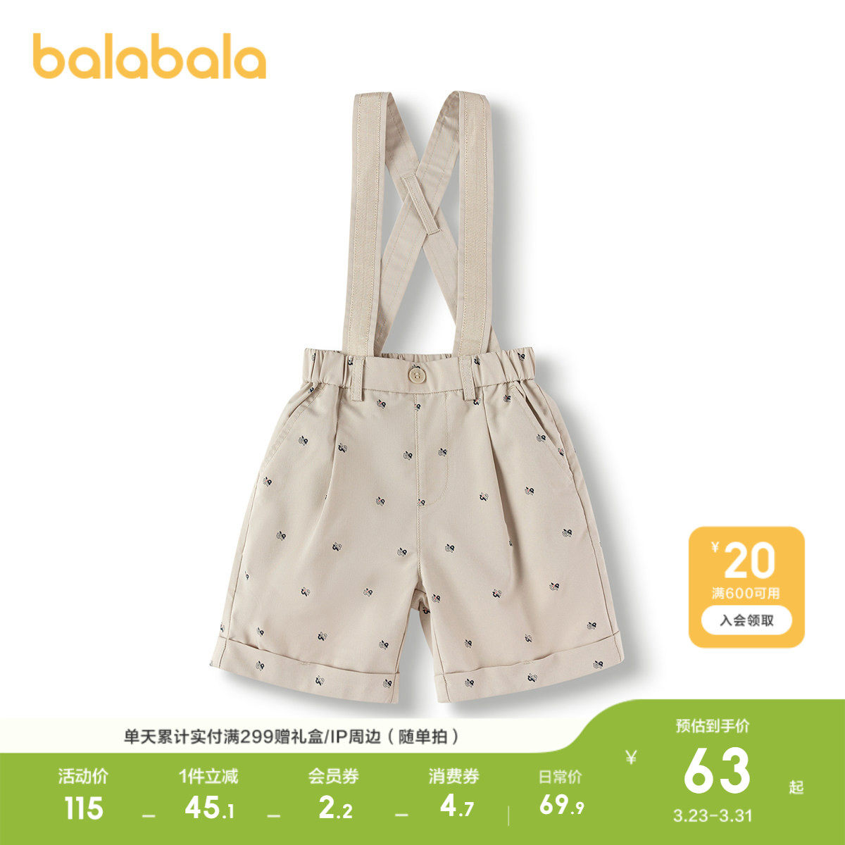 巴拉巴拉童装男童背带裤儿童裤子凉感抗菌夏季小童满印中裤时尚潮