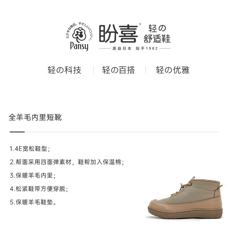 Pansy盼喜日本短靴女百搭保暖羊毛棉靴舒适平底加绒加厚靴子冬季