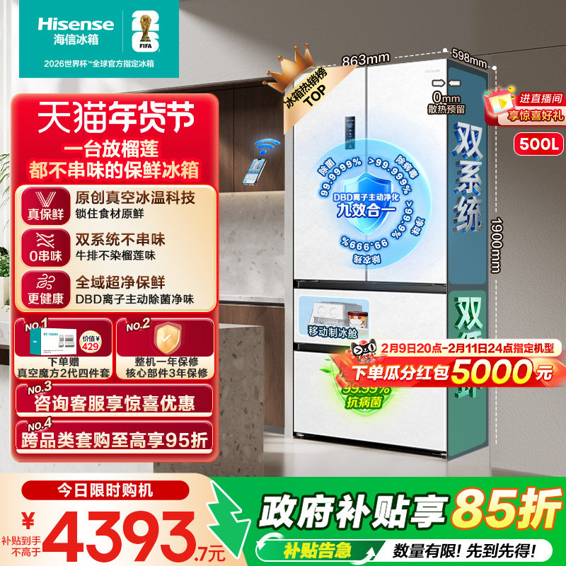 海信小榴莲500冰箱真空保鲜零嵌入法式四开门双系统超薄制冰一级