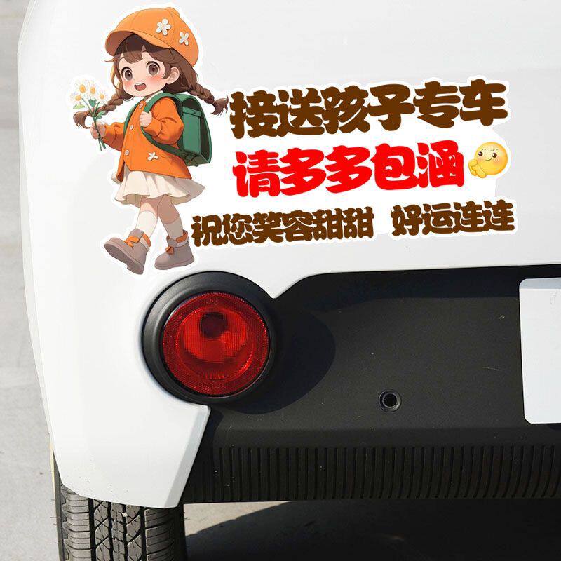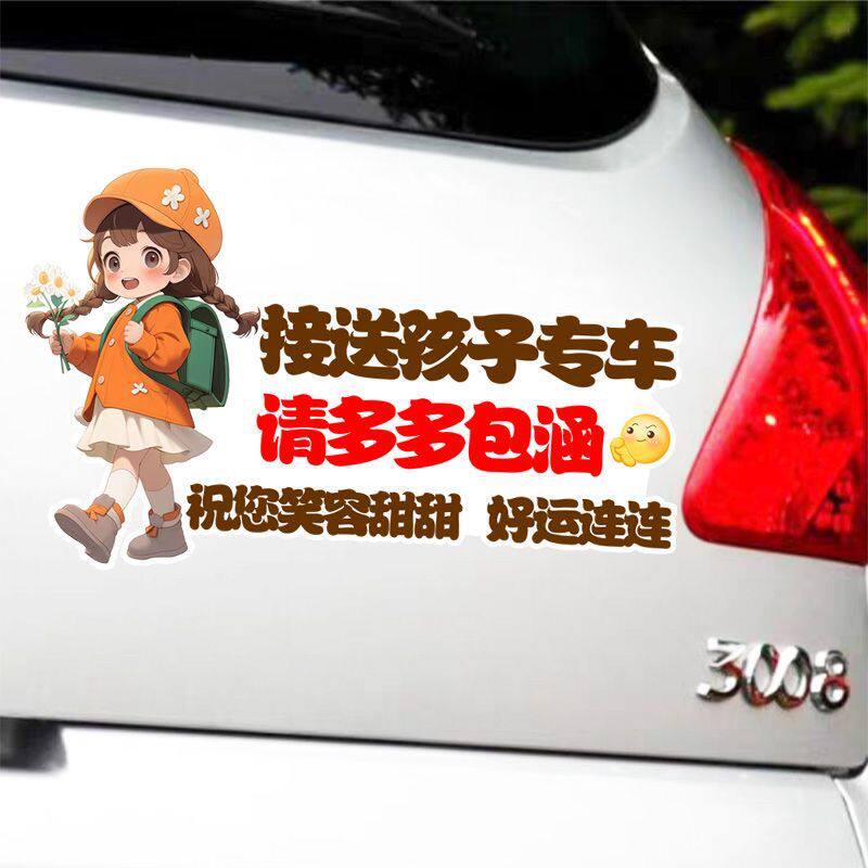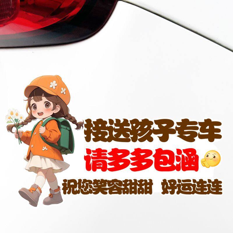 接送孩子请多多包涵卡通女孩划痕遮挡车贴防水防晒警示汽车贴纸