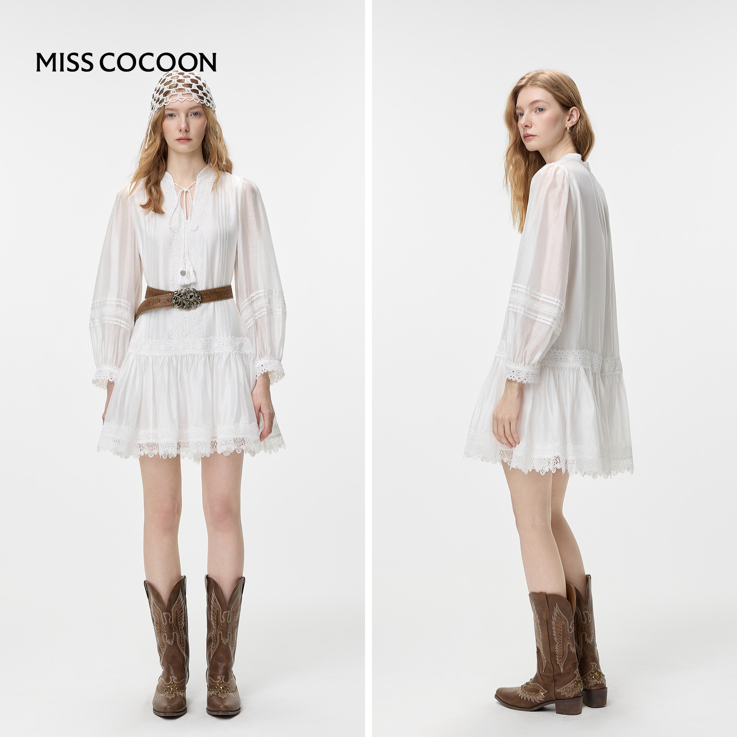 何超莲同款可可尼V领长袖白色裙子女26春新款清新莱赛尔连衣裙