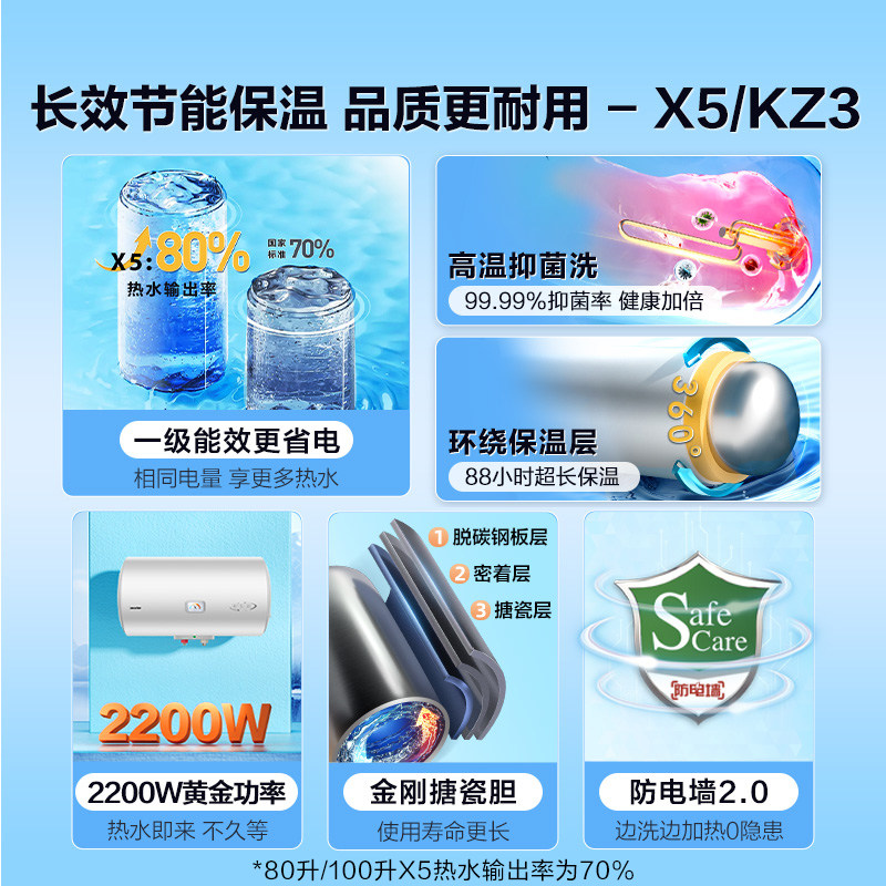 海尔出品统帅电热水器小型家用租房洗澡一级能效速热50升60升X5