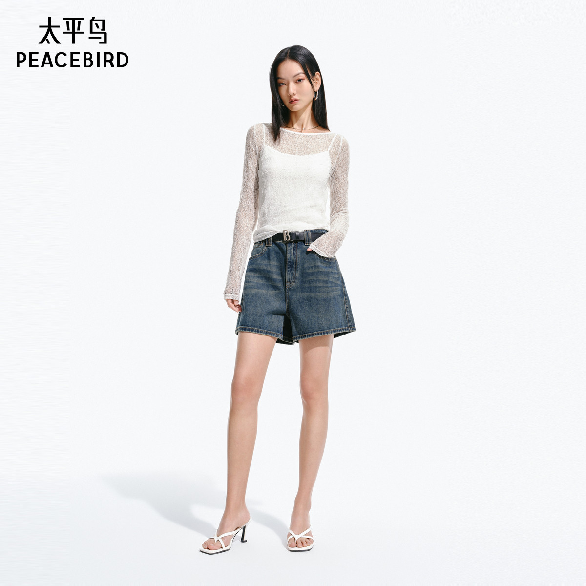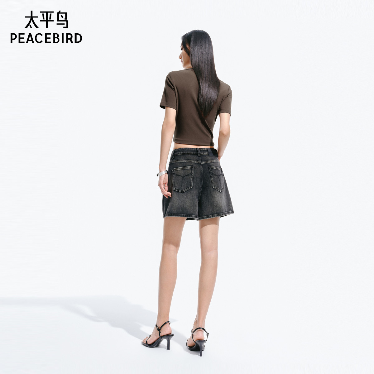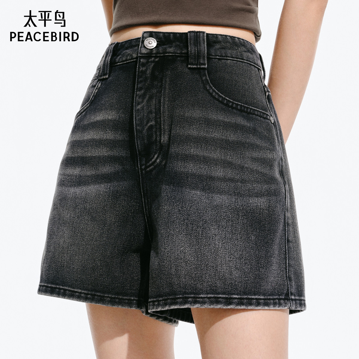 太平鸟高腰牛仔中短裤2025年夏季新款复古水洗A字阔腿牛仔短裤子