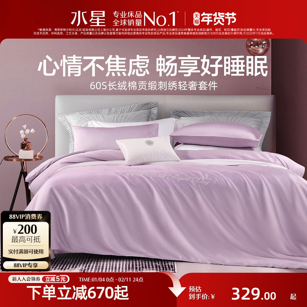 水星家纺60支新疆长绒棉贡缎抗菌四件套刺绣全棉套件轻奢床单被套