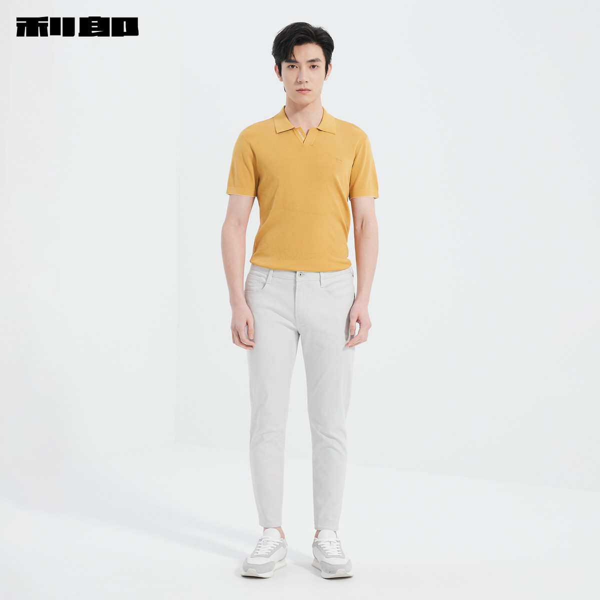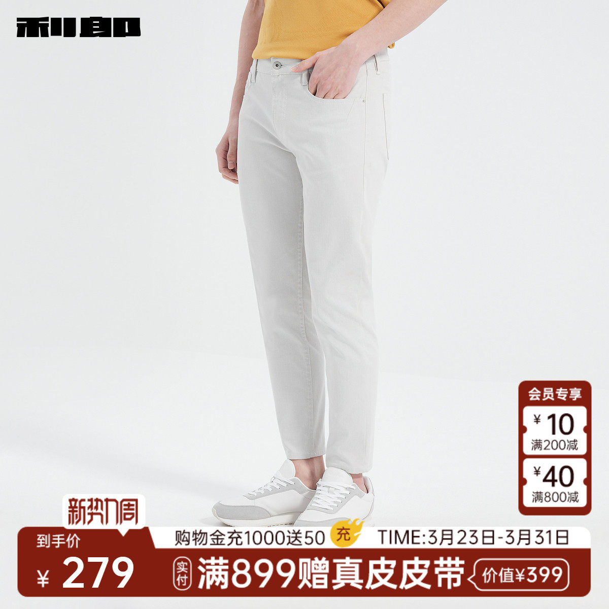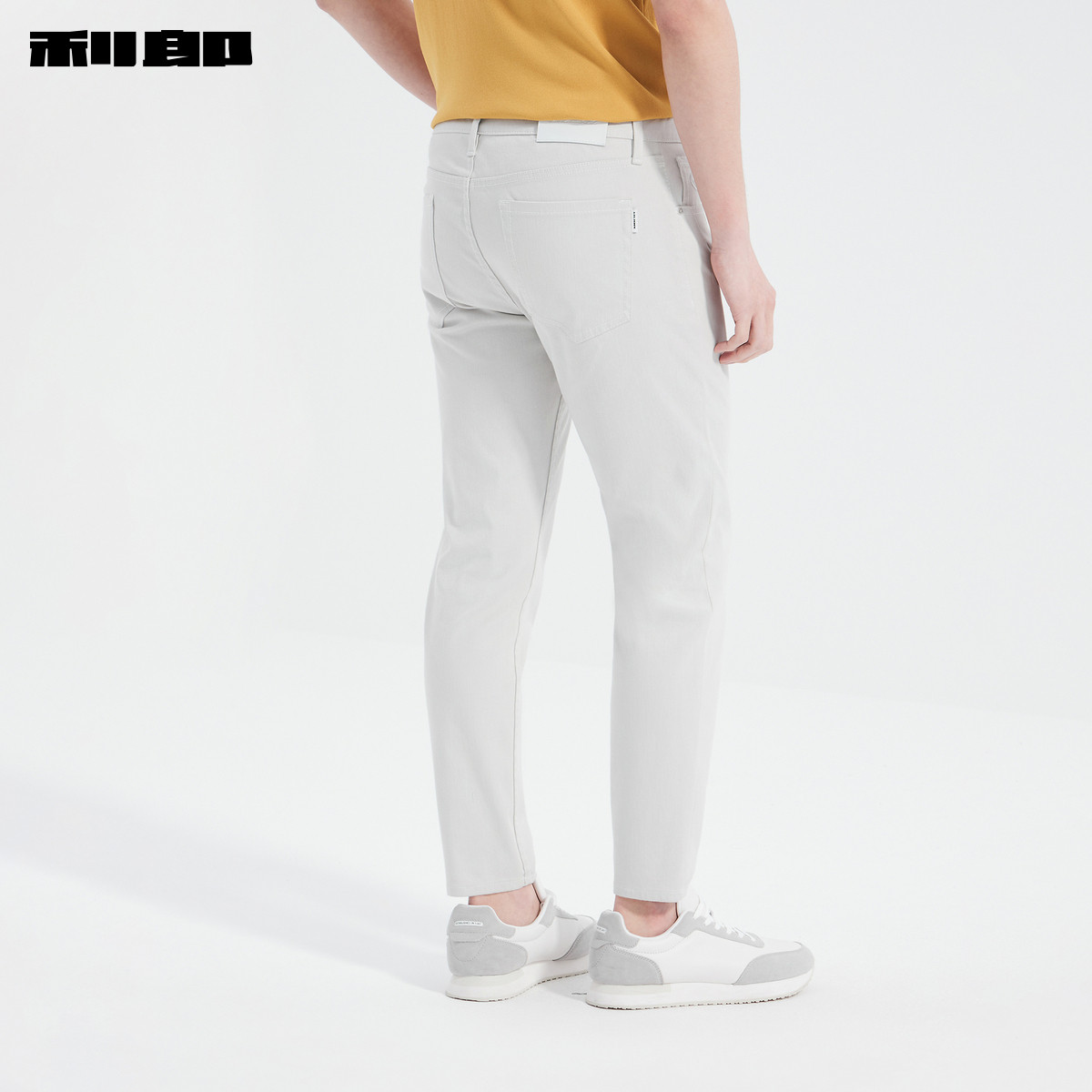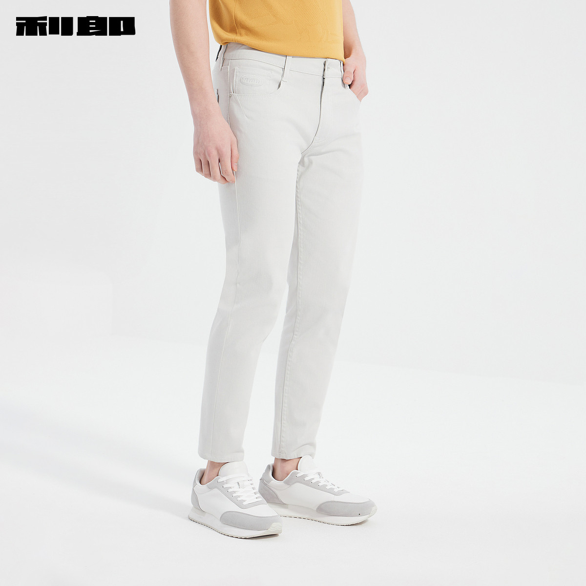 利郎官方正品 九分牛仔裤男春季新款小脚裤弹力刺绣米白色裤子男