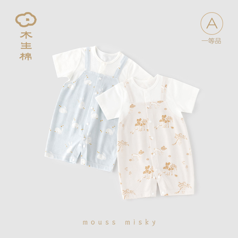 木生棉男女宝宝短袖连体衣夏季薄款婴儿假两件哈衣纯棉爬服外出服