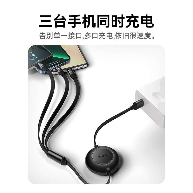 倍思数据线三合一充电线器一拖三快充三头适用多头车载苹果Typec充手机车超级车用汽车USB伸缩多功能多用电器