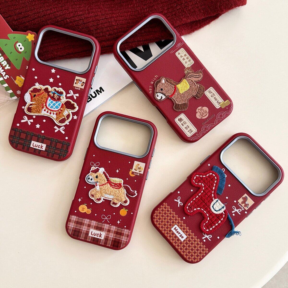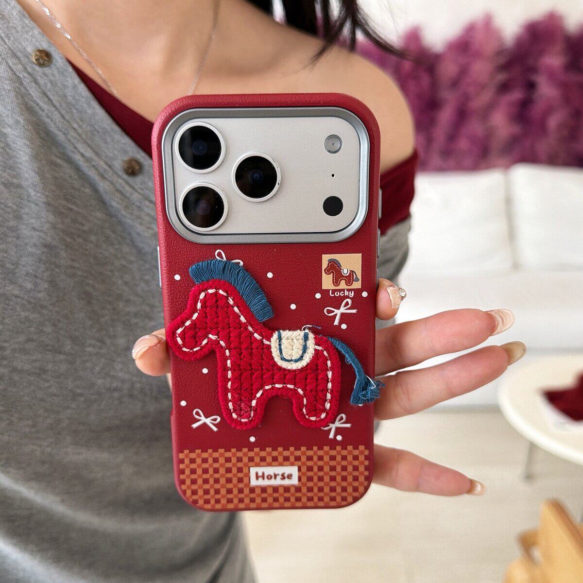 新年2026酒红色刺绣小马适用苹果17promax软胶16P防摔15保护套14带手绳壳13简约