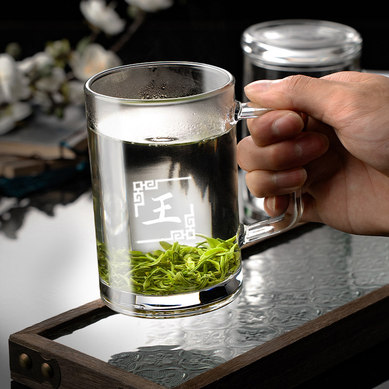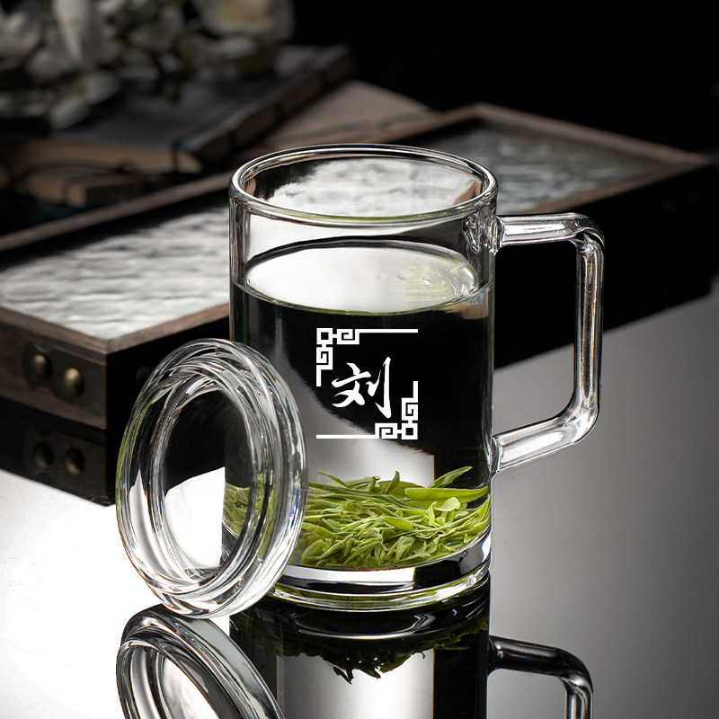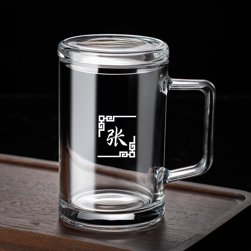 带把玻璃杯家用办公泡茶加厚带盖子水杯百家姓刻字杯子-350ml姓氏