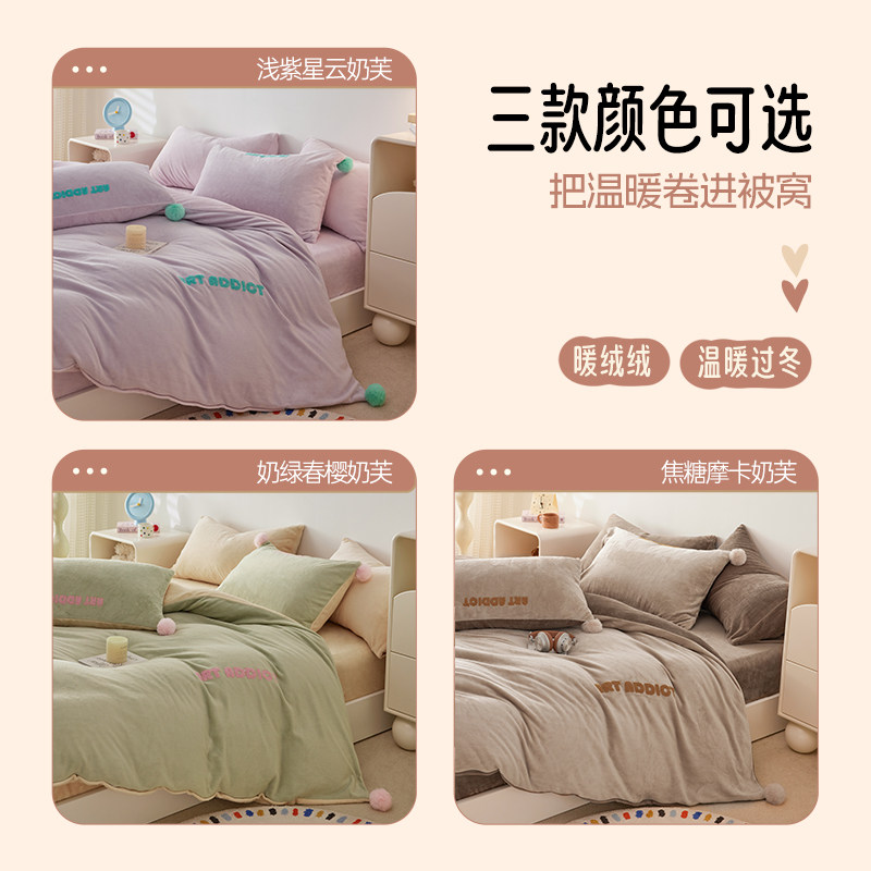 秋冬季加厚四件套牛奶绒被套床单双面加绒被罩床笠学生宿舍三件套