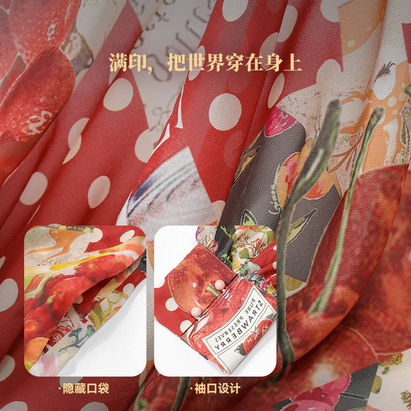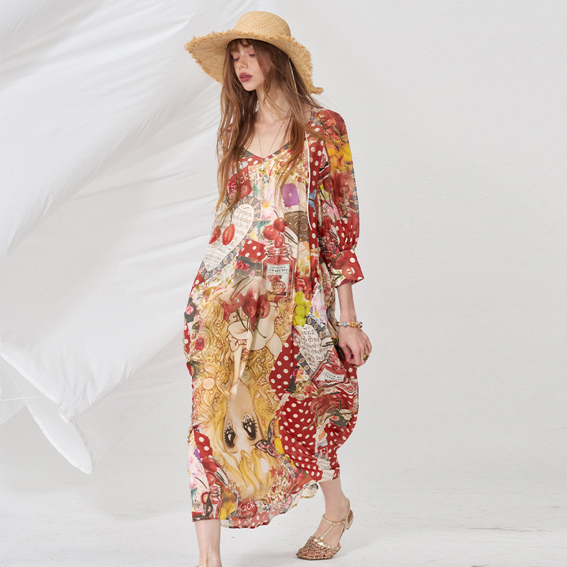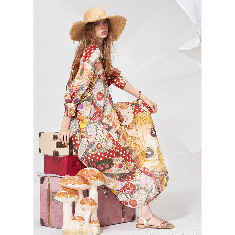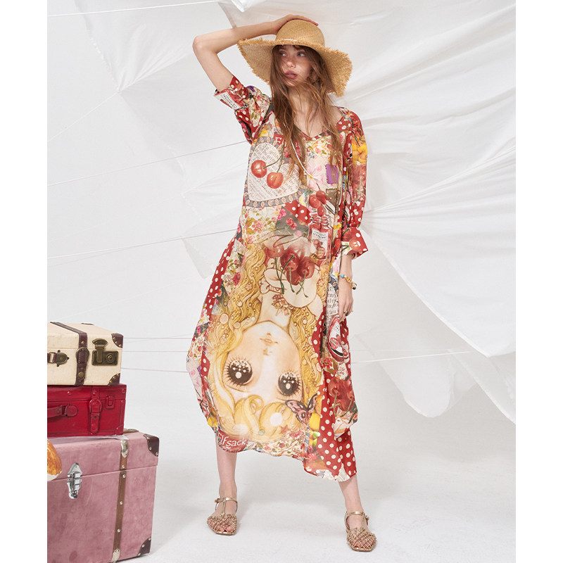 妖精的口袋鬼马满印宽松连衣裙女2026夏新款甜美海边度假风袍子裙