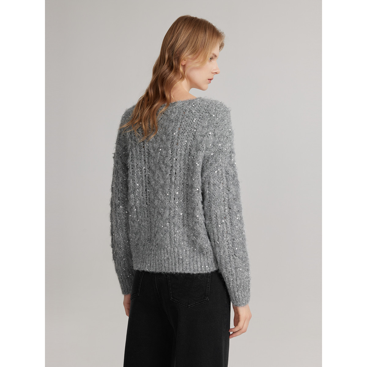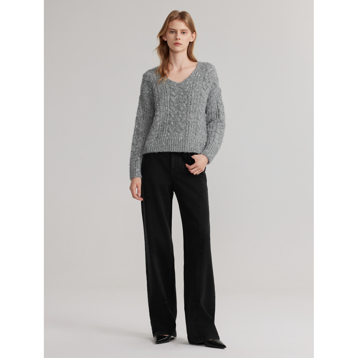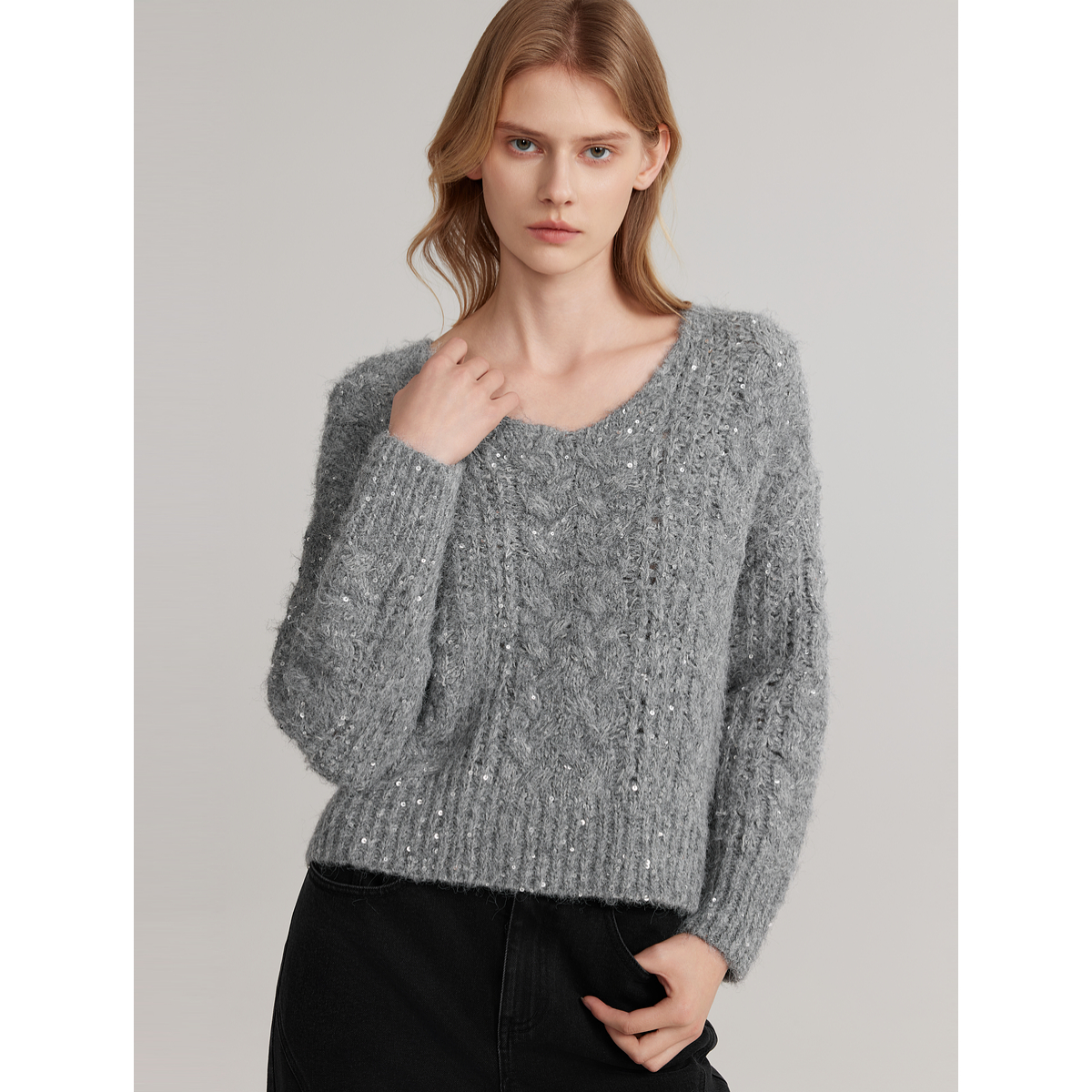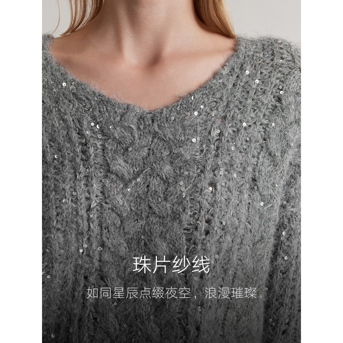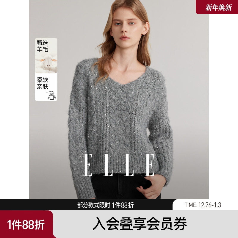 【商场同款】ELLE绵羊毛设计感V领亮片毛衣女2025冬新款宽松套头