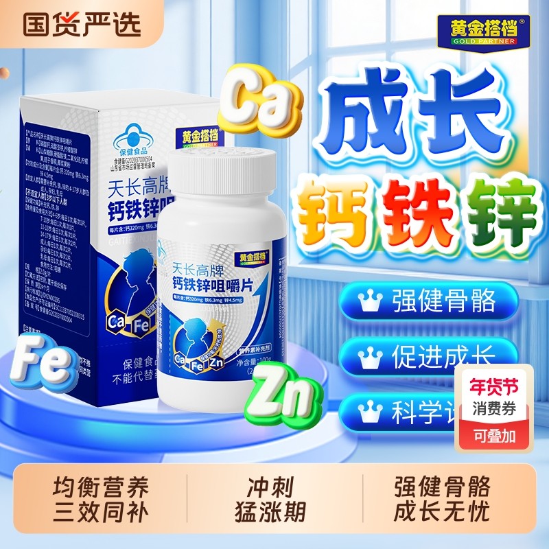 黄金搭档天长高牌钙铁锌咀嚼片儿童成长补钙长高补锌增强免疫力