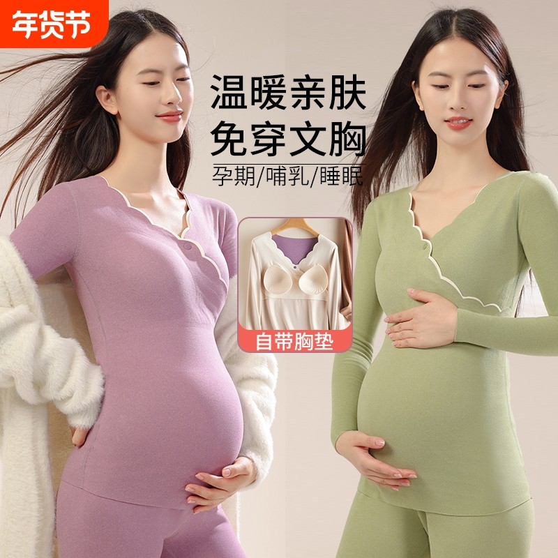 孕妇哺乳秋衣秋裤套装带胸垫秋冬季内搭上衣产后喂奶德绒保暖内衣