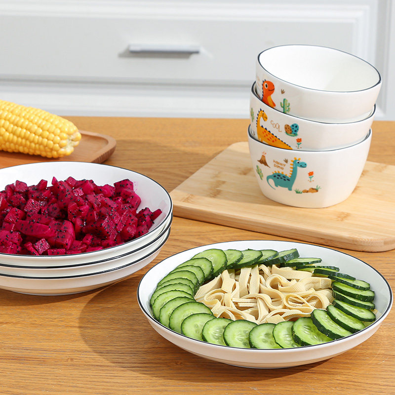 创意卡通可爱萌宠恐龙饭碗餐盘组合套装家用高颜值陶瓷方形碗菜盘