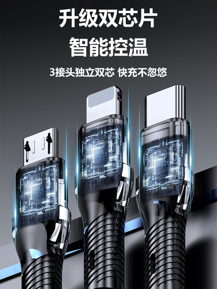 超级快充三合一数据线通用充电线适用苹果荣耀华为OPPO小米VIVO手机通用车载一拖三数据线透明芯片type-c带灯