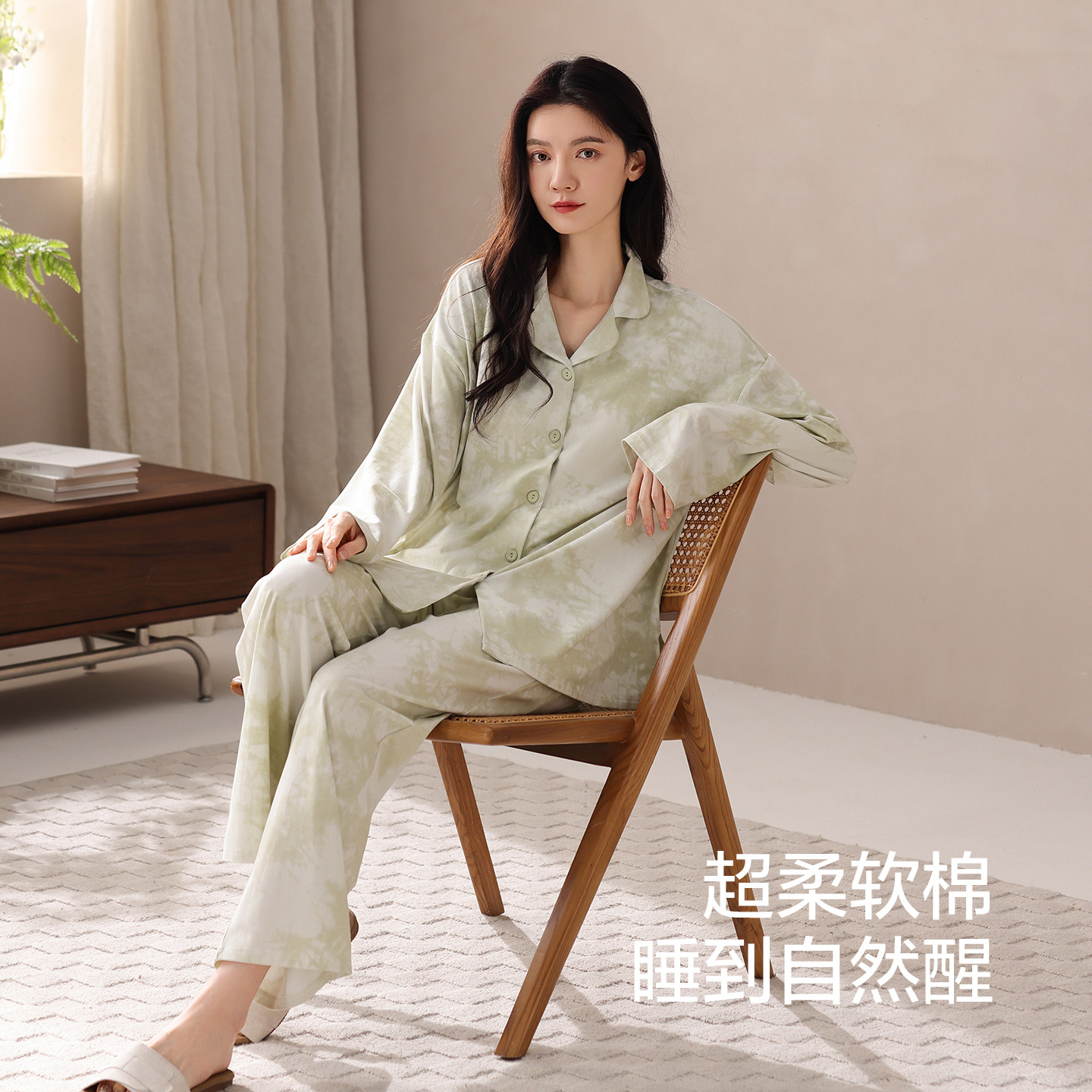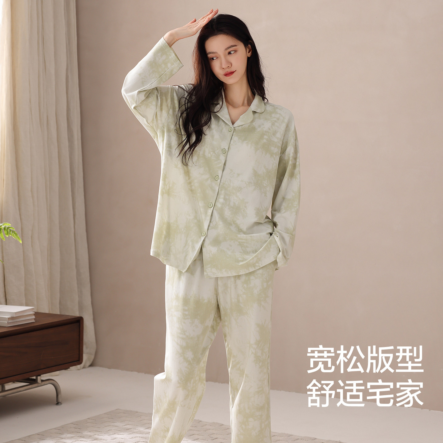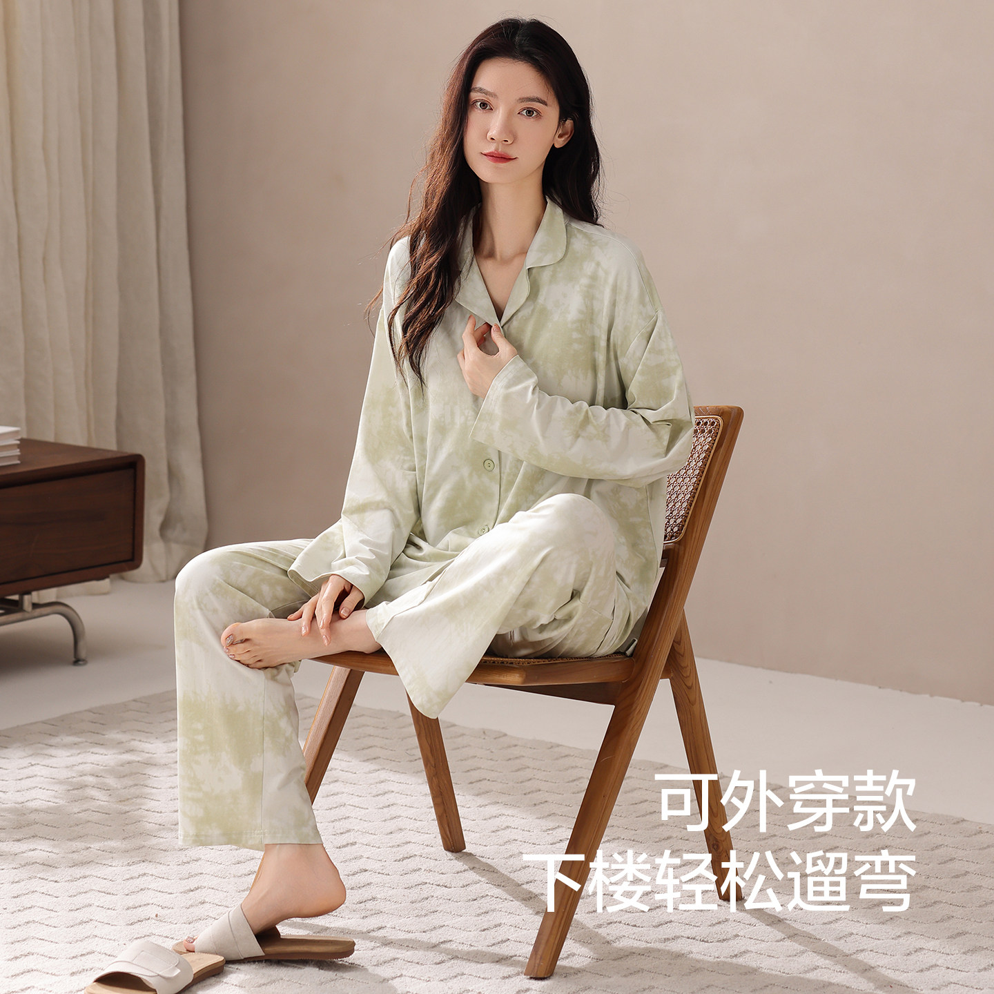 新中式国风竹叶睡衣女春秋款带胸垫长袖长裤甜美少女家居服套装dg