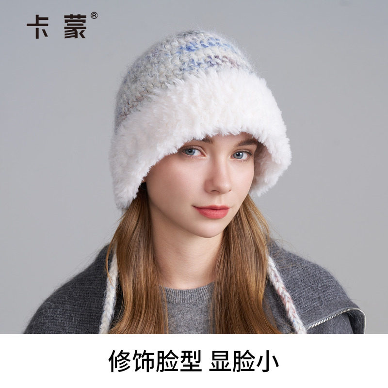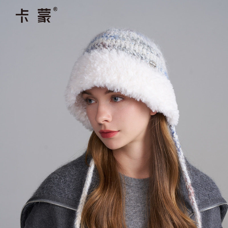 卡蒙飘带护耳针织帽女士2025新款显脸小保暖毛线帽大头毛绒冬帽子