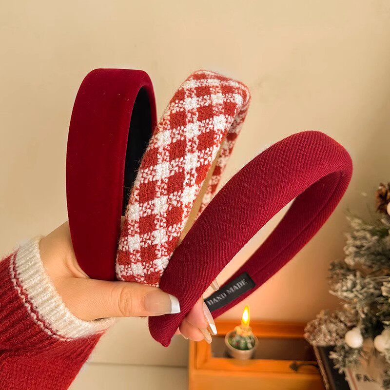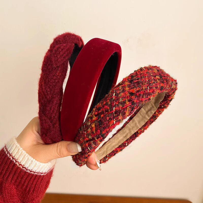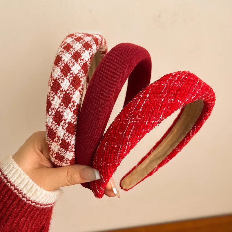 红色港风复古发箍女秋冬酒红色高颅顶编制头箍高级感发饰头饰格子