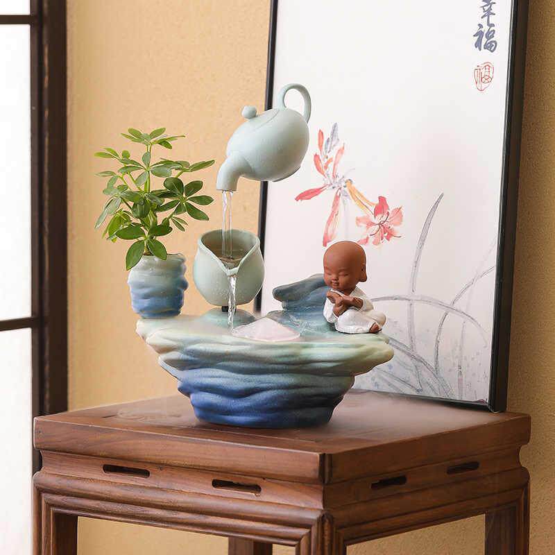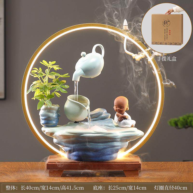 禅意中式流水器办公室桌面摆件灯圈悬空壶客厅玄关软装饰流水景观