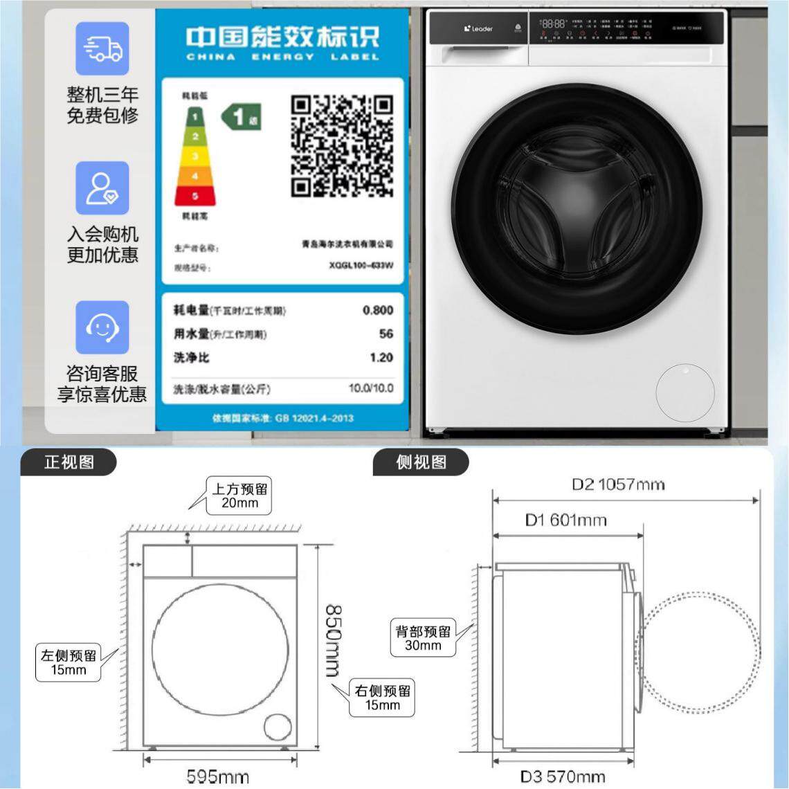 以旧换新补贴海尔出品统帅10kg滚筒洗衣机全自动超薄洗脱一体633