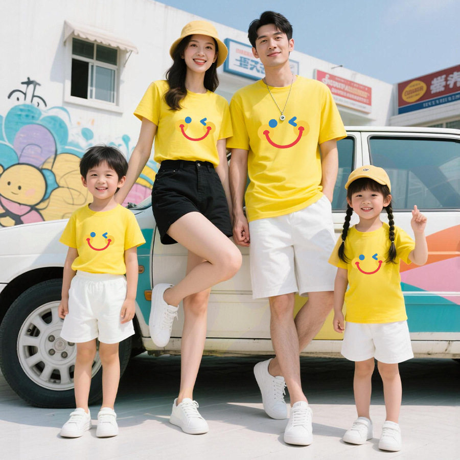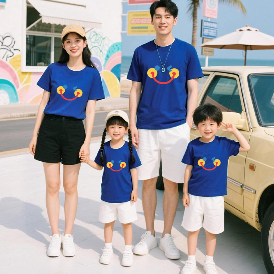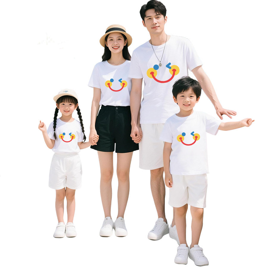 2026夏季纯棉短袖t恤亲子装一家三口笑脸印花图案家庭装班服短袖
