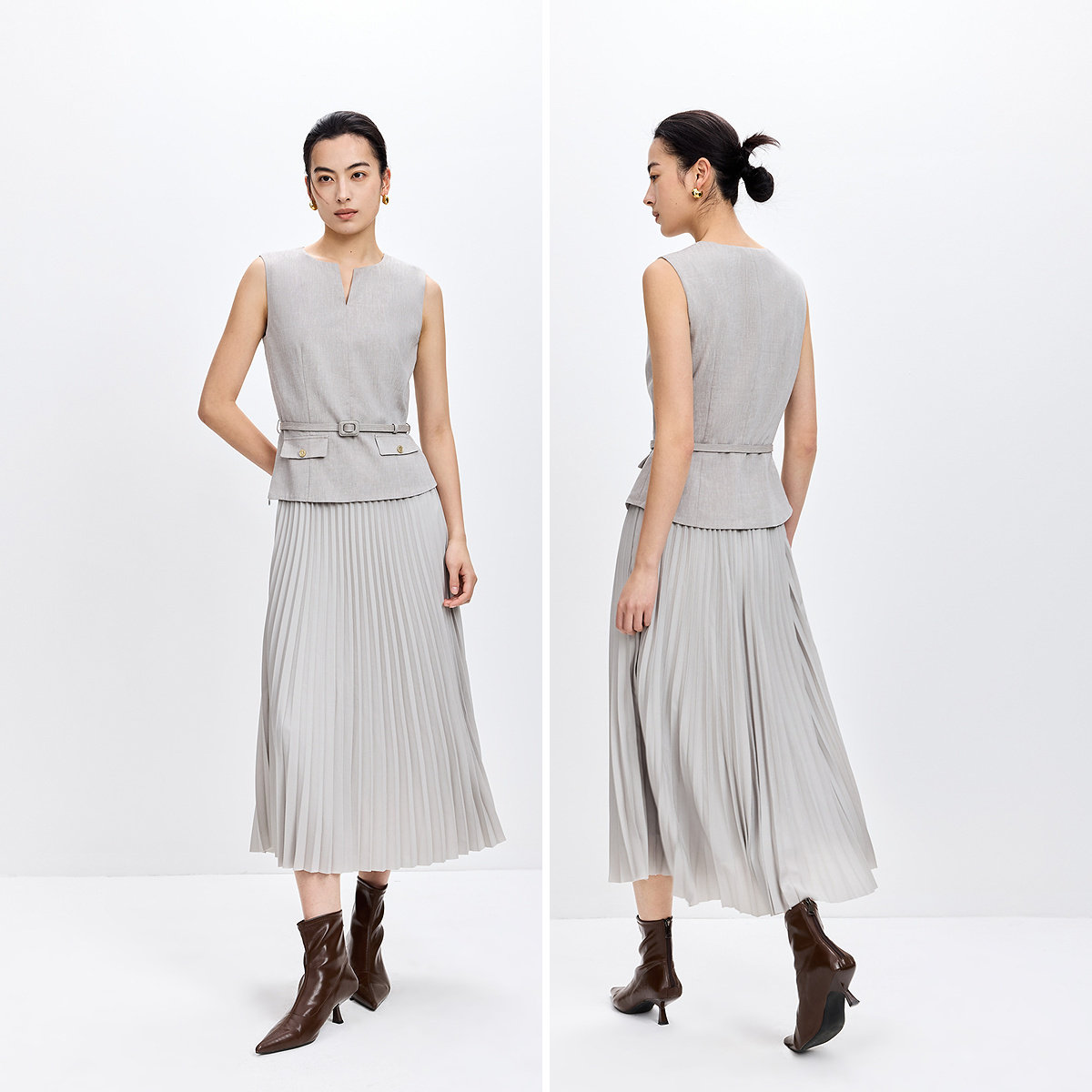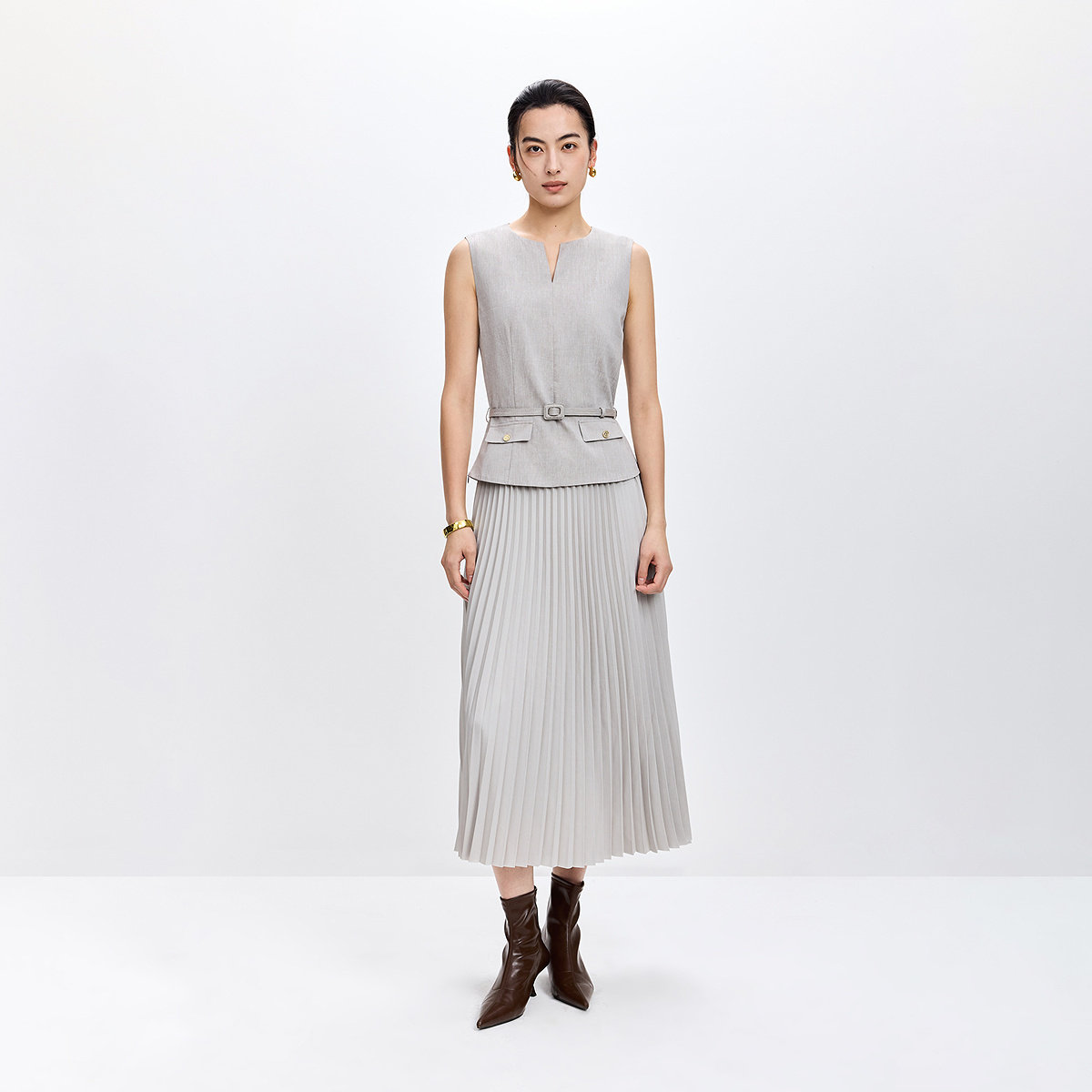 LILY2026春新款莱赛尔亚麻混纺无袖圆领气质通勤浅色拼接连衣裙女
