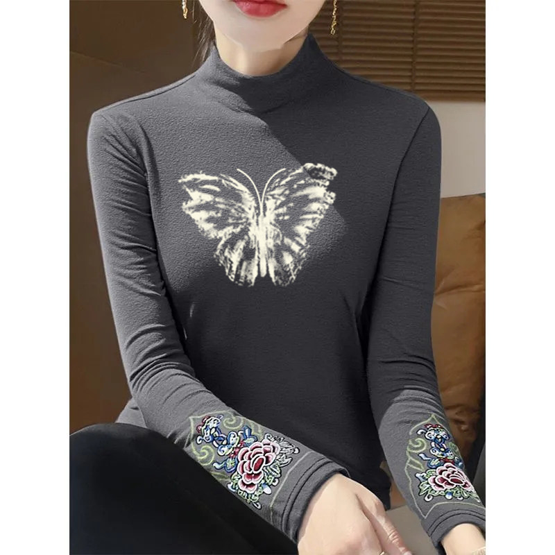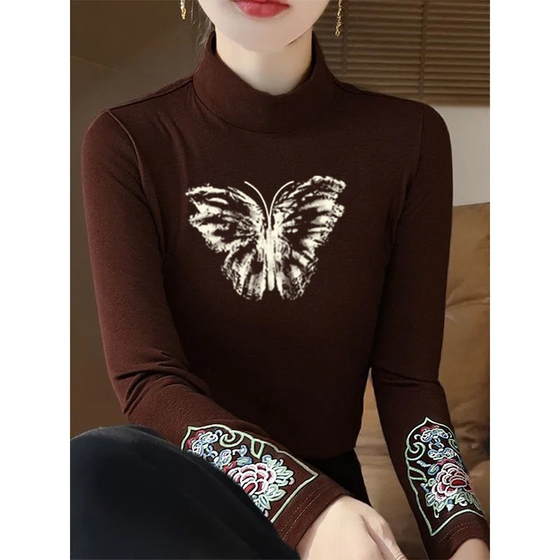 秋冬半高领德绒打底衫女复古民族风长袖中式T恤国风印花保暖上衣