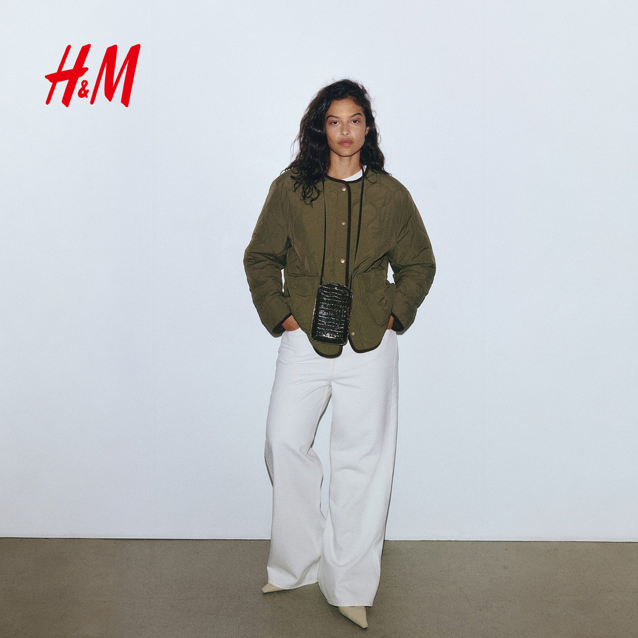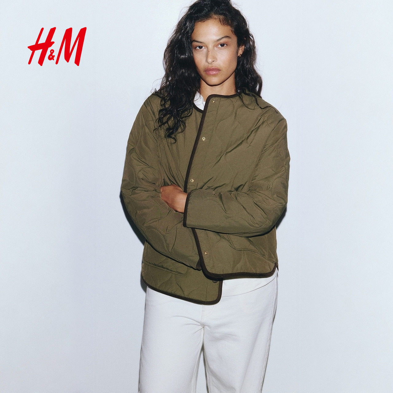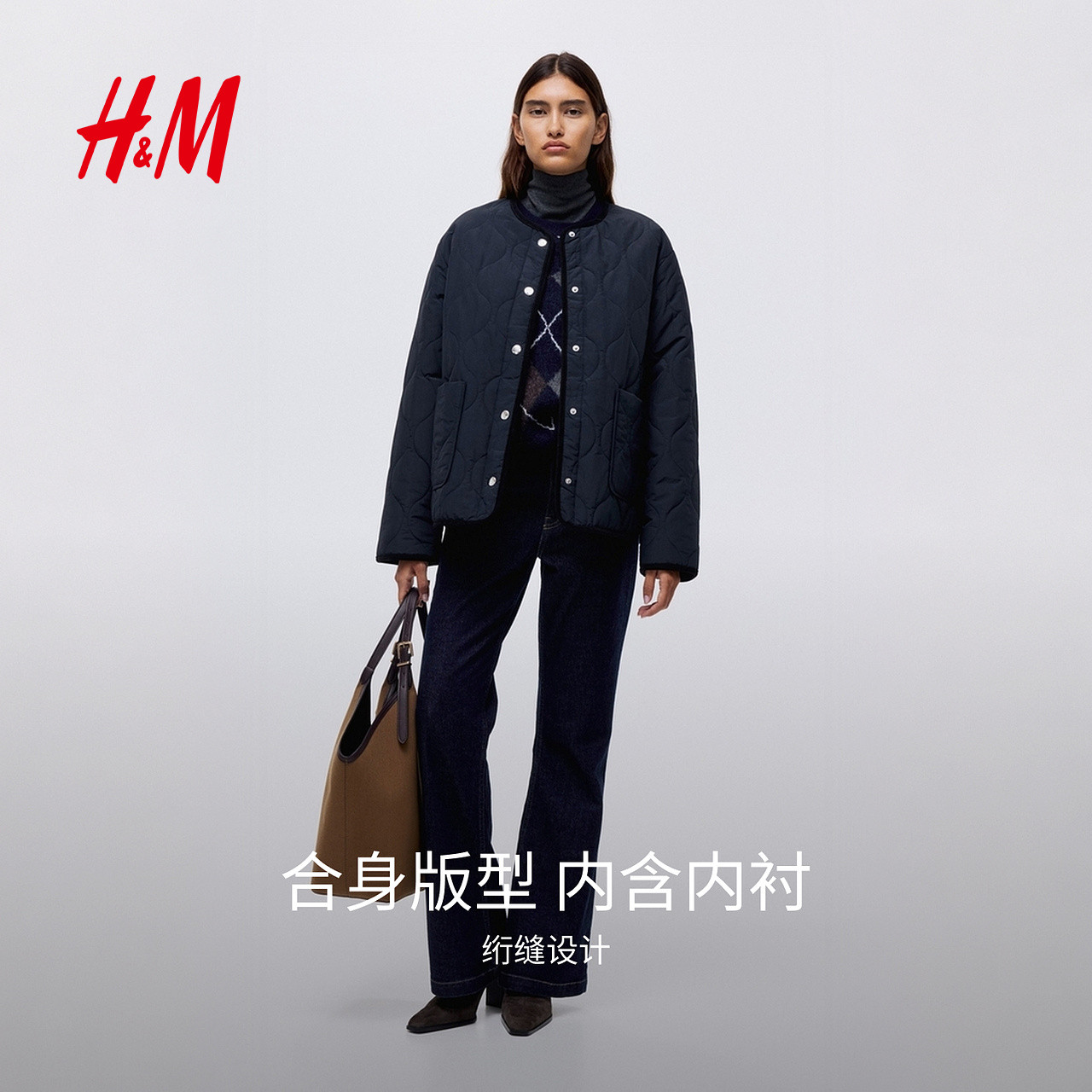 HM女装菱格纹棉服冬季绗缝夹克圆领洋气外套棉衣1302230