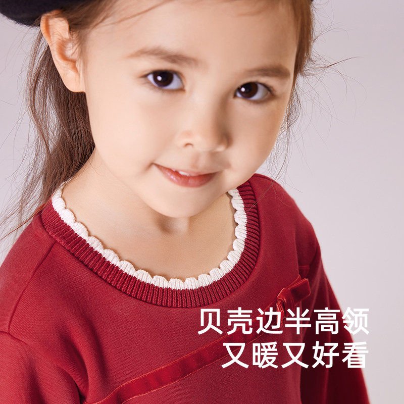 英氏女童连衣裙长袖加绒秋冬儿童过年喜庆拜年服红色新年周岁裙子