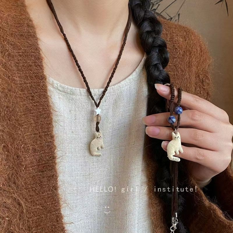 植绒小猫吊坠编织绳项链配饰女秋冬款小众高级感个性长款毛衣链