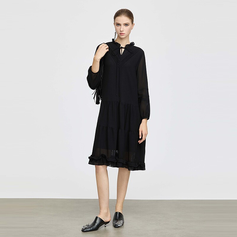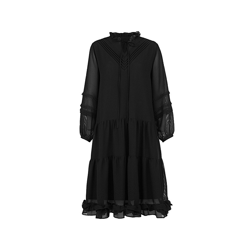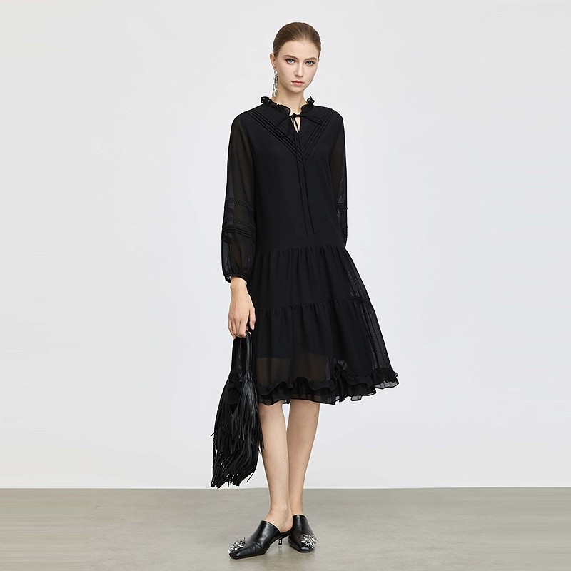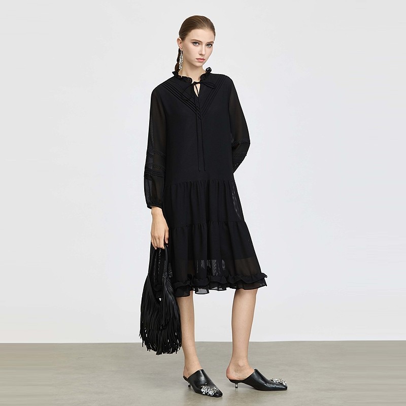 sdeer圣迪奥女装25年秋木耳边圆领花边泡泡袖连衣裙S25361201