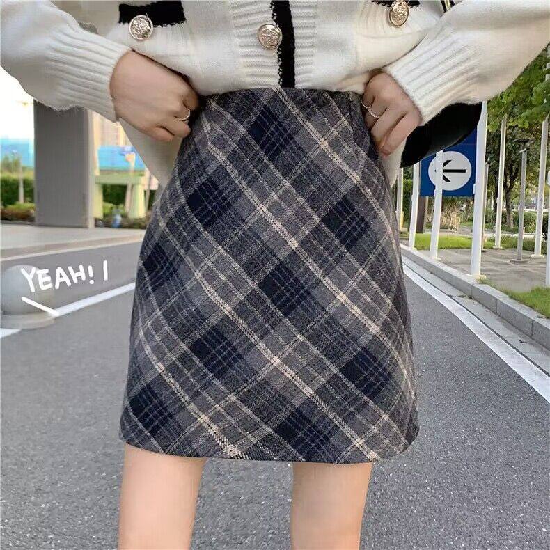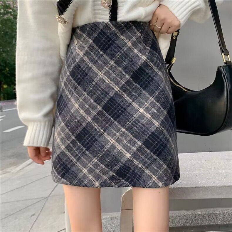 大码格子毛呢半身裙女秋冬胖mm高腰显瘦遮胯a字裙小个子包臀短裙