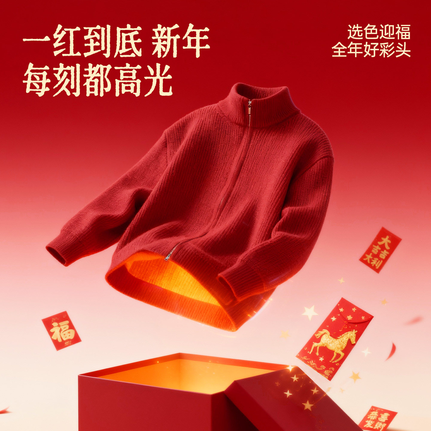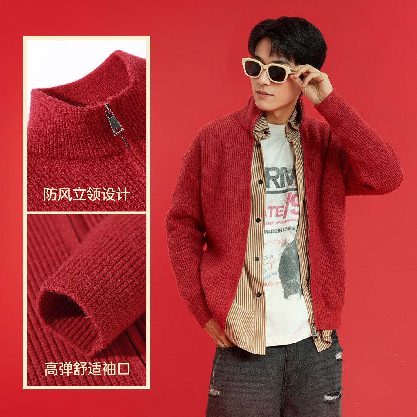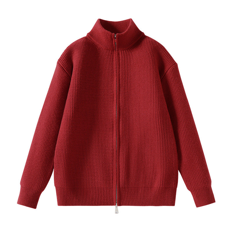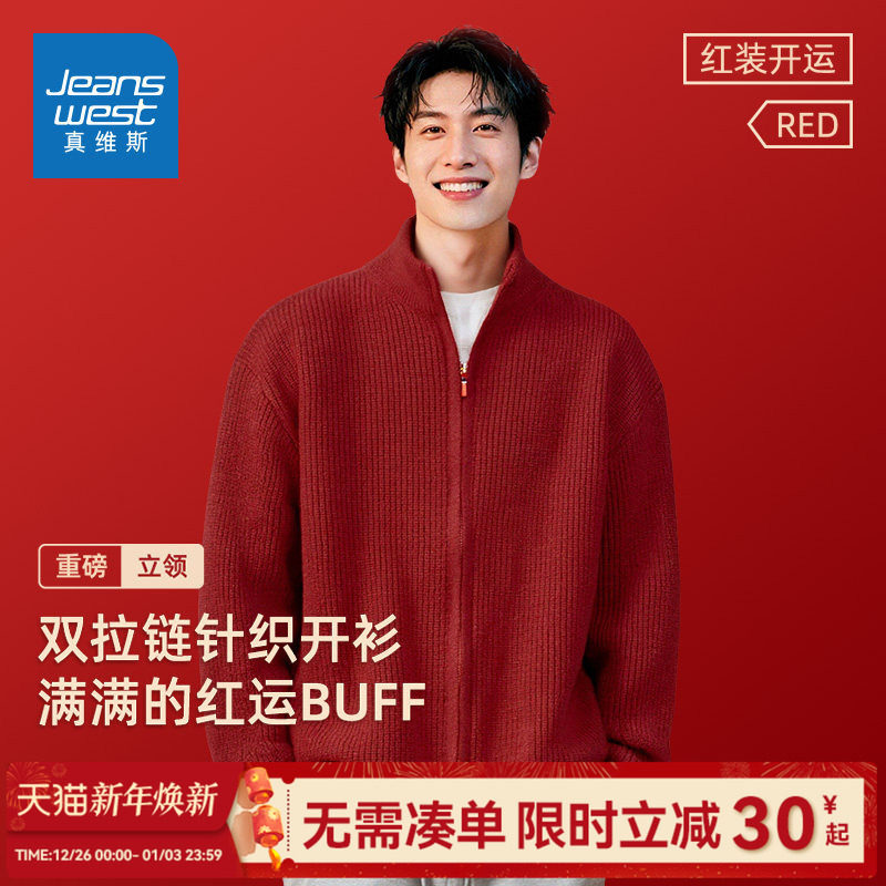 GV真维斯安可拉红色毛衣男冬加绒厚开衫外套2026马年本命年衣服C