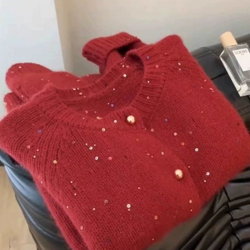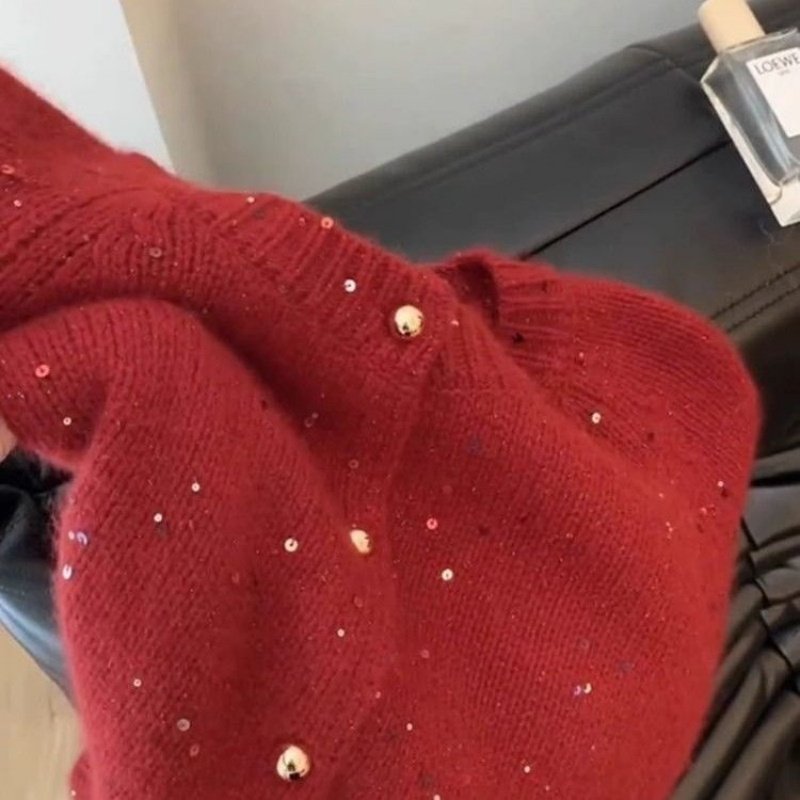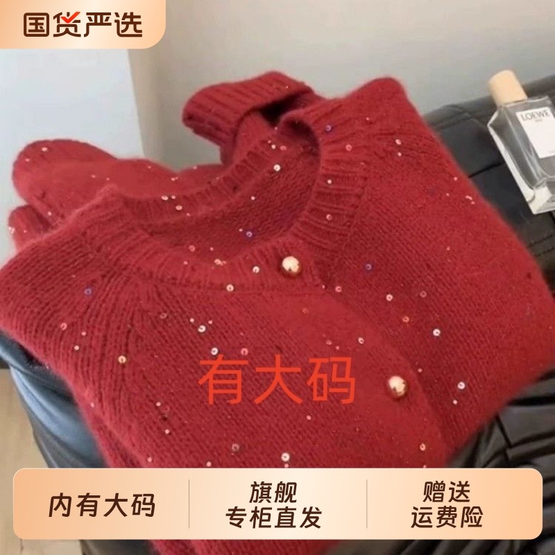 重工亮片本命年红色开衫女2025年爆款宽松漂亮大码内搭浣熊绒毛衣